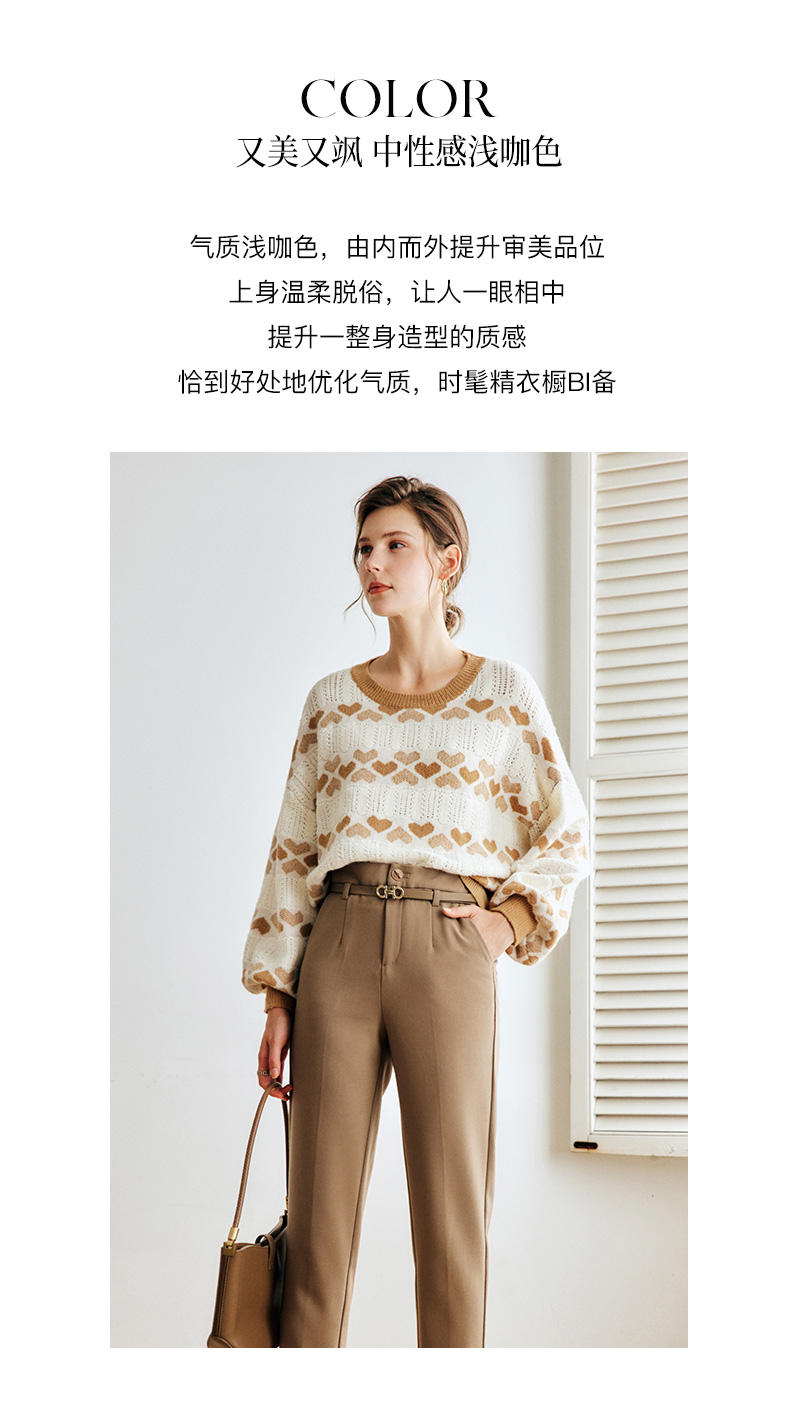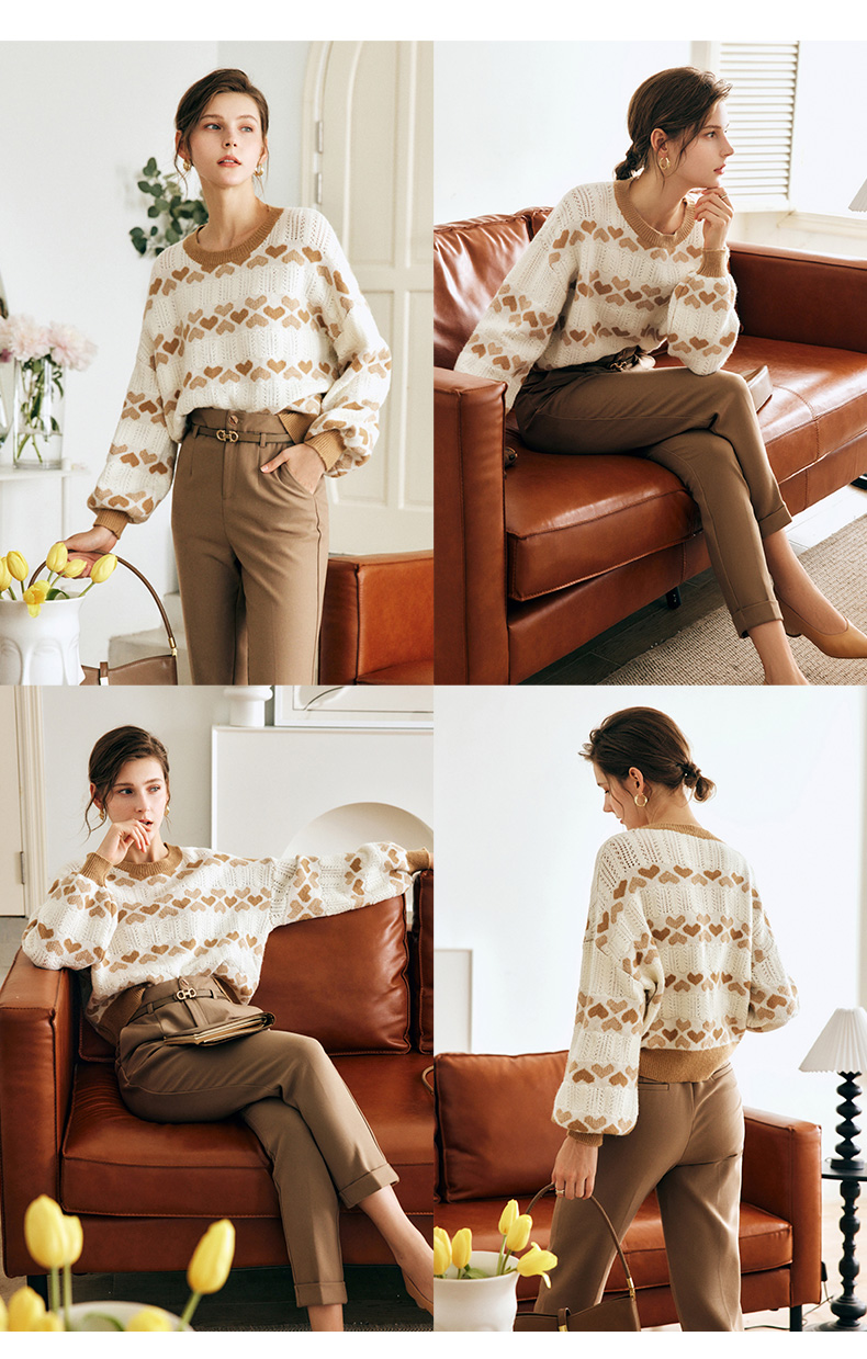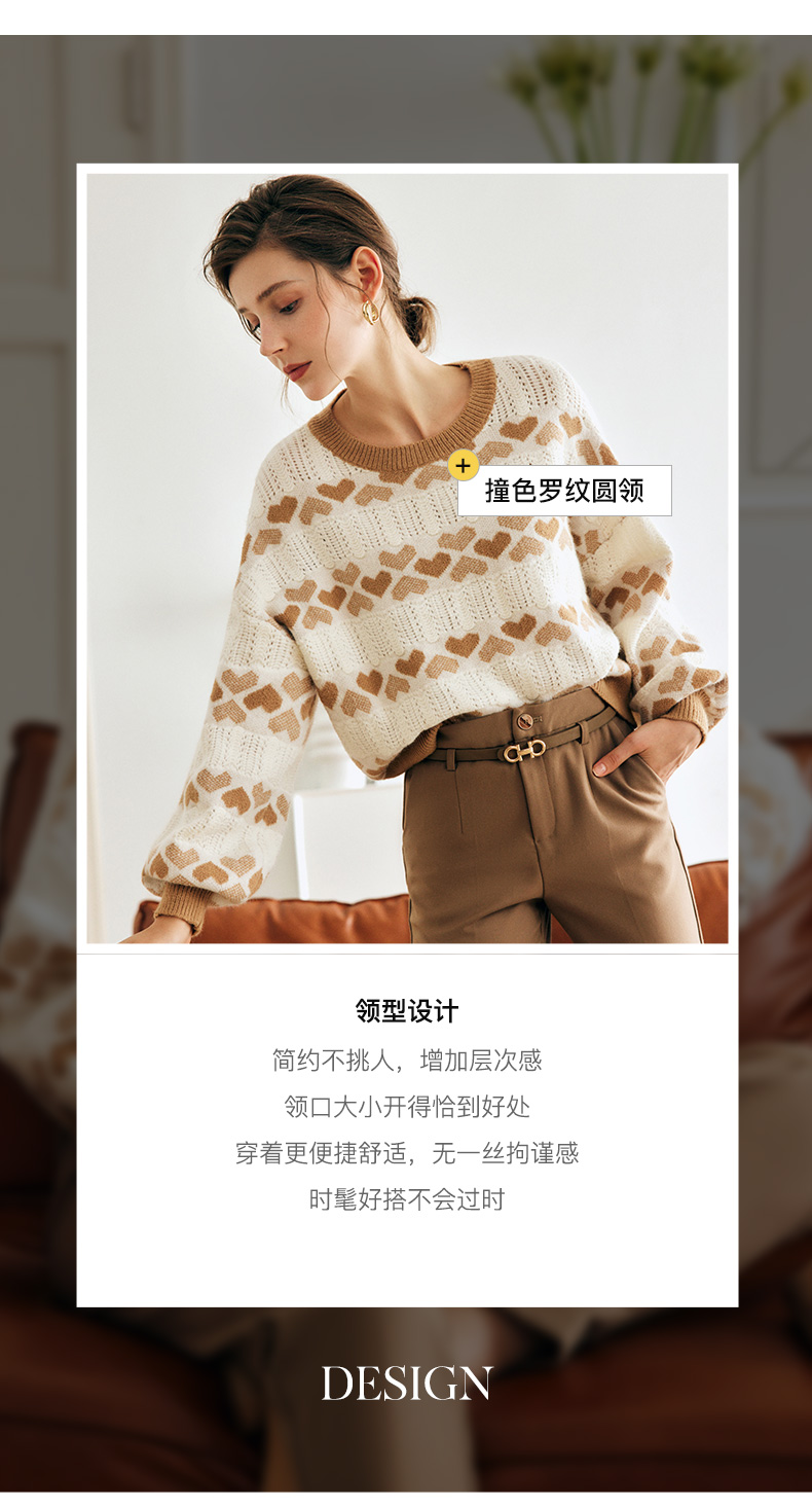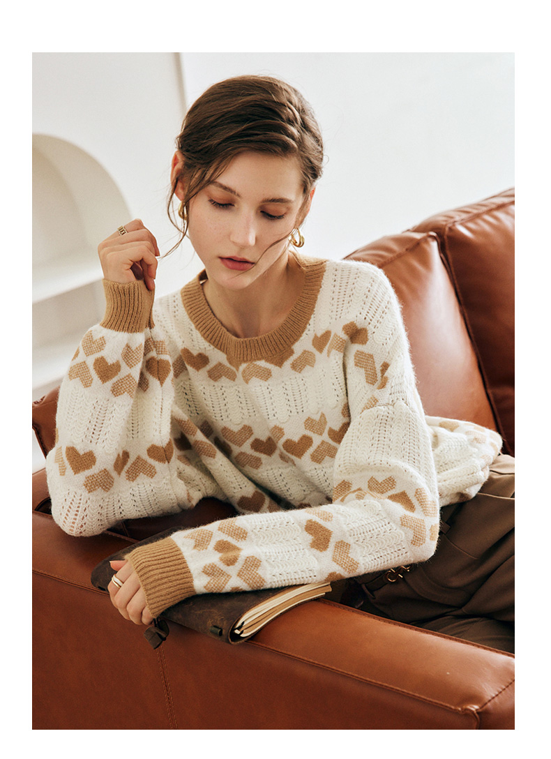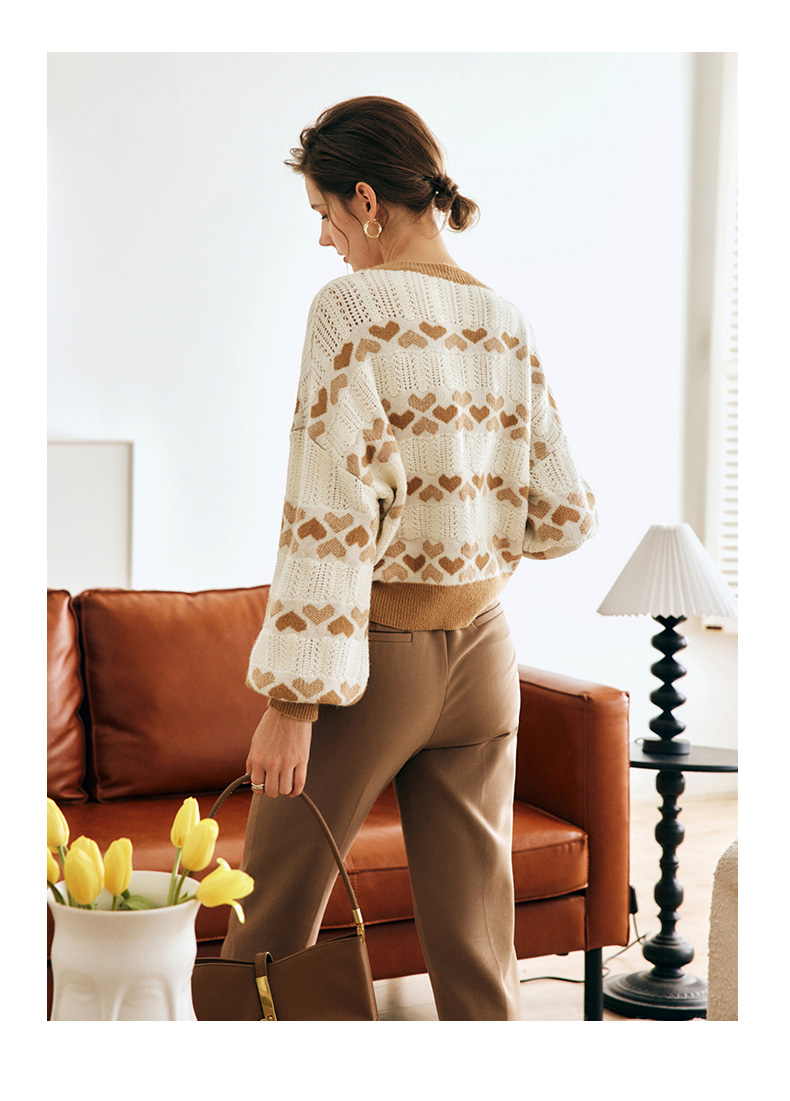 OLrain欧芮儿法式咖色提花毛衣女秋冬2022新款宽松爱心撞色针织衫