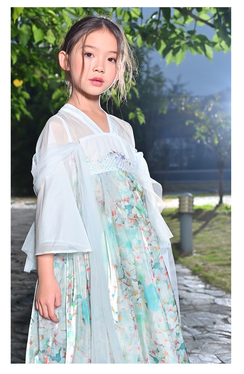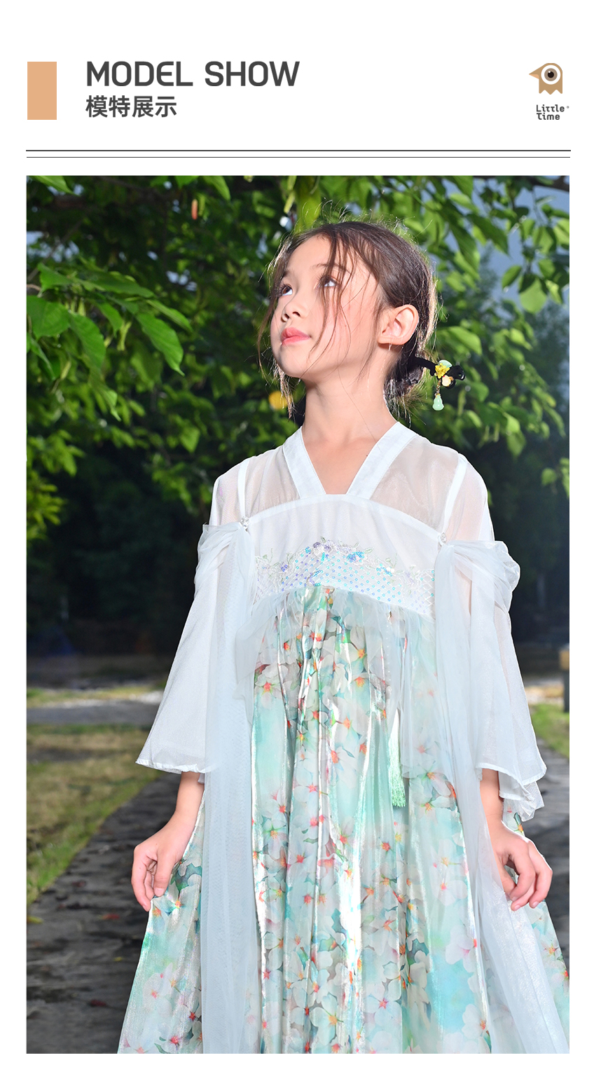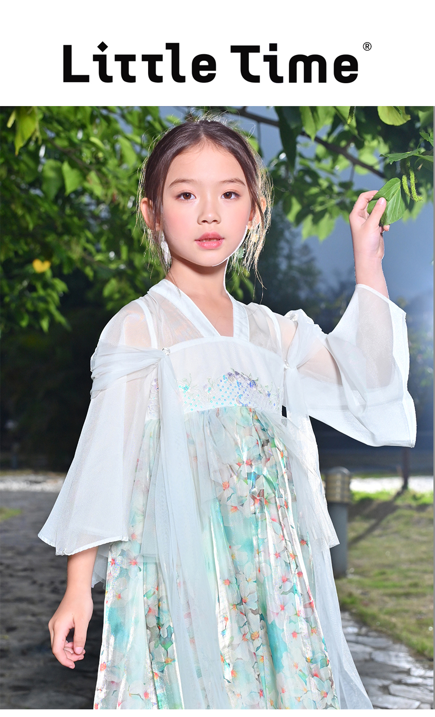 littletime女童绿色中国风碎花汉服中袖连衣裙女孩夏季连衣裙