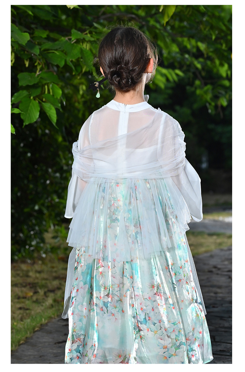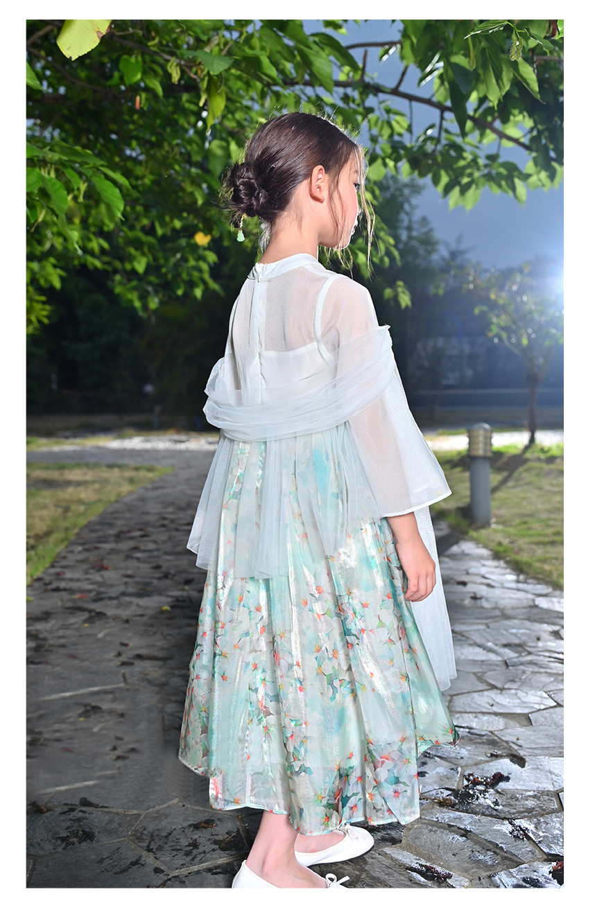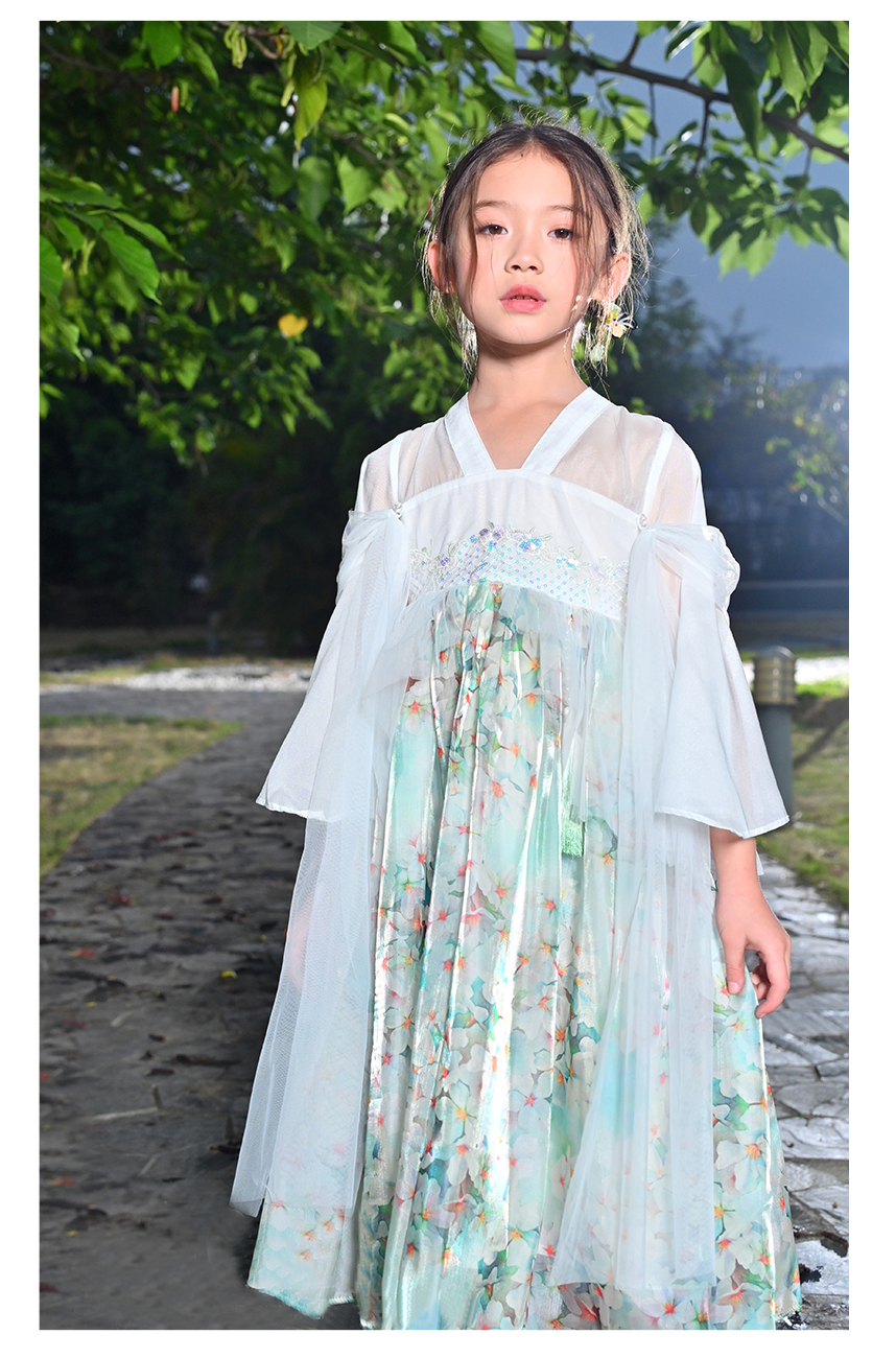 littletime女童绿色中国风碎花汉服中袖连衣裙女孩夏季连衣裙