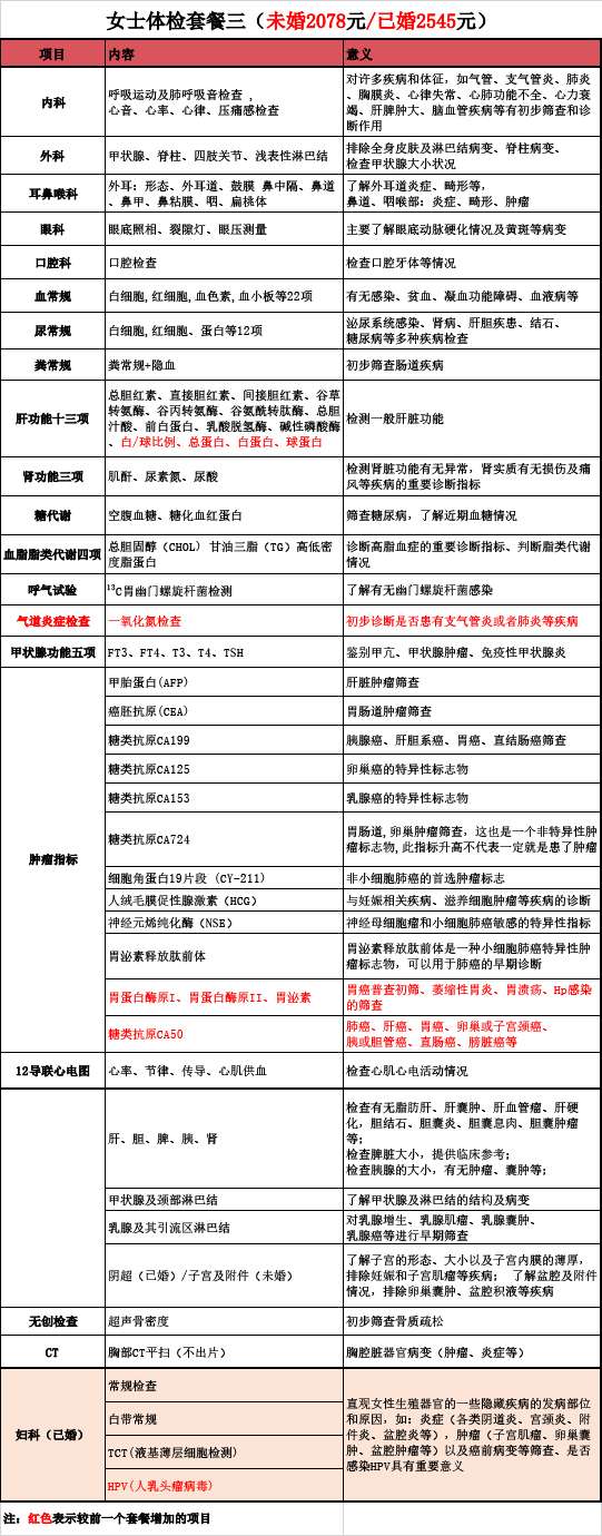 东方医院体检套餐三女:原价:女未婚2078元,女已婚2545元
