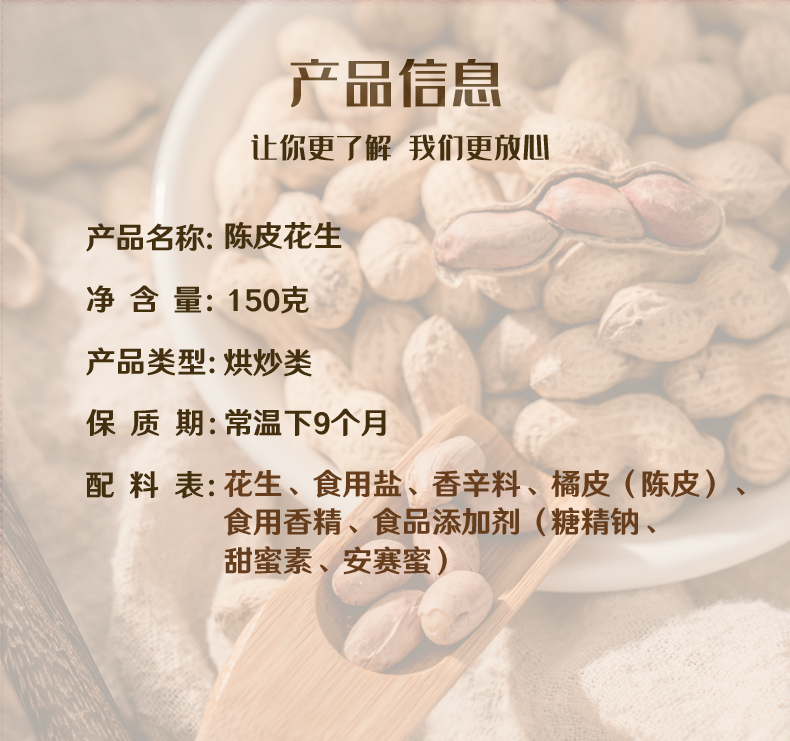 商品详情 品名:陈皮花生 规格:150克 保质期:9个月 发货地:苏州 发货快递:顺丰 中通 申通 (不可指定) |