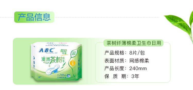 ABC 澳洲茶树精华 棉柔表层 纤薄日用卫生巾240mm*8片