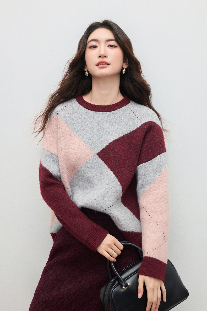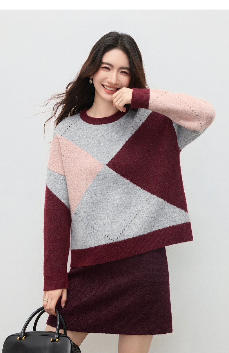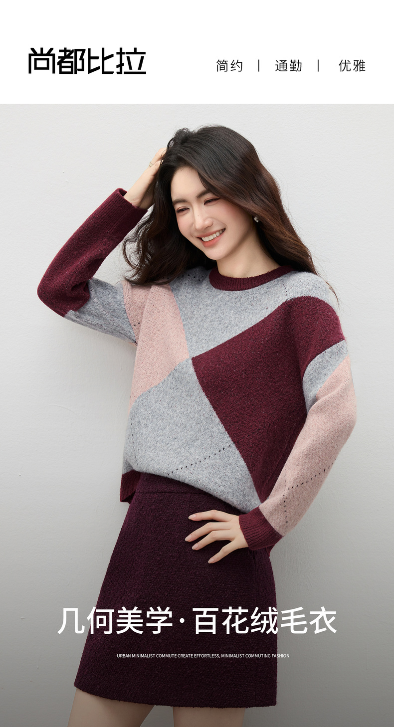【内购】【几何美学】时尚撞色芝麻地镂空设计圆领宽松含绵羊毛百花绒毛衣-W54ED3765