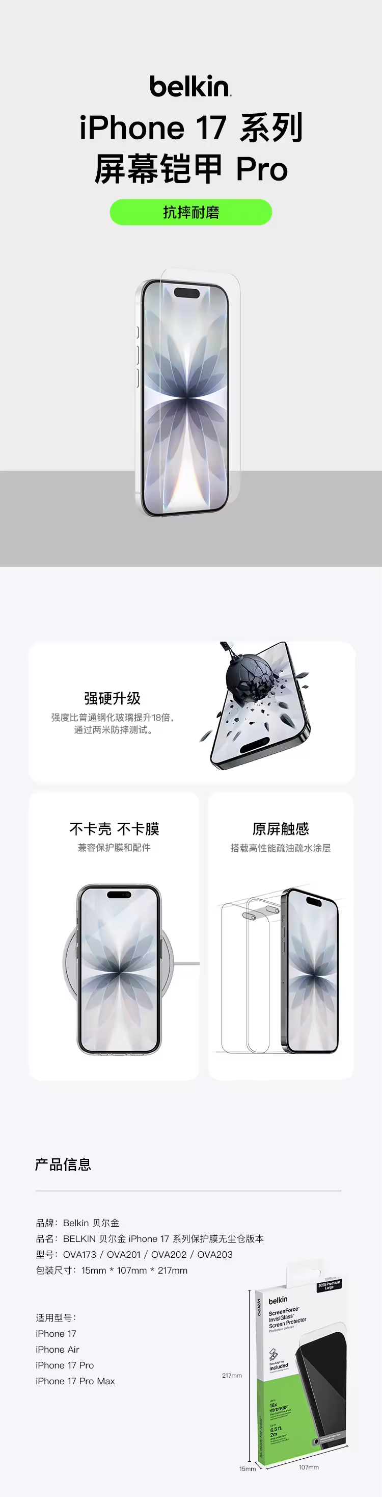 BELKIN贝尔金 iPhone 17 系列 无尘仓玻璃膜
