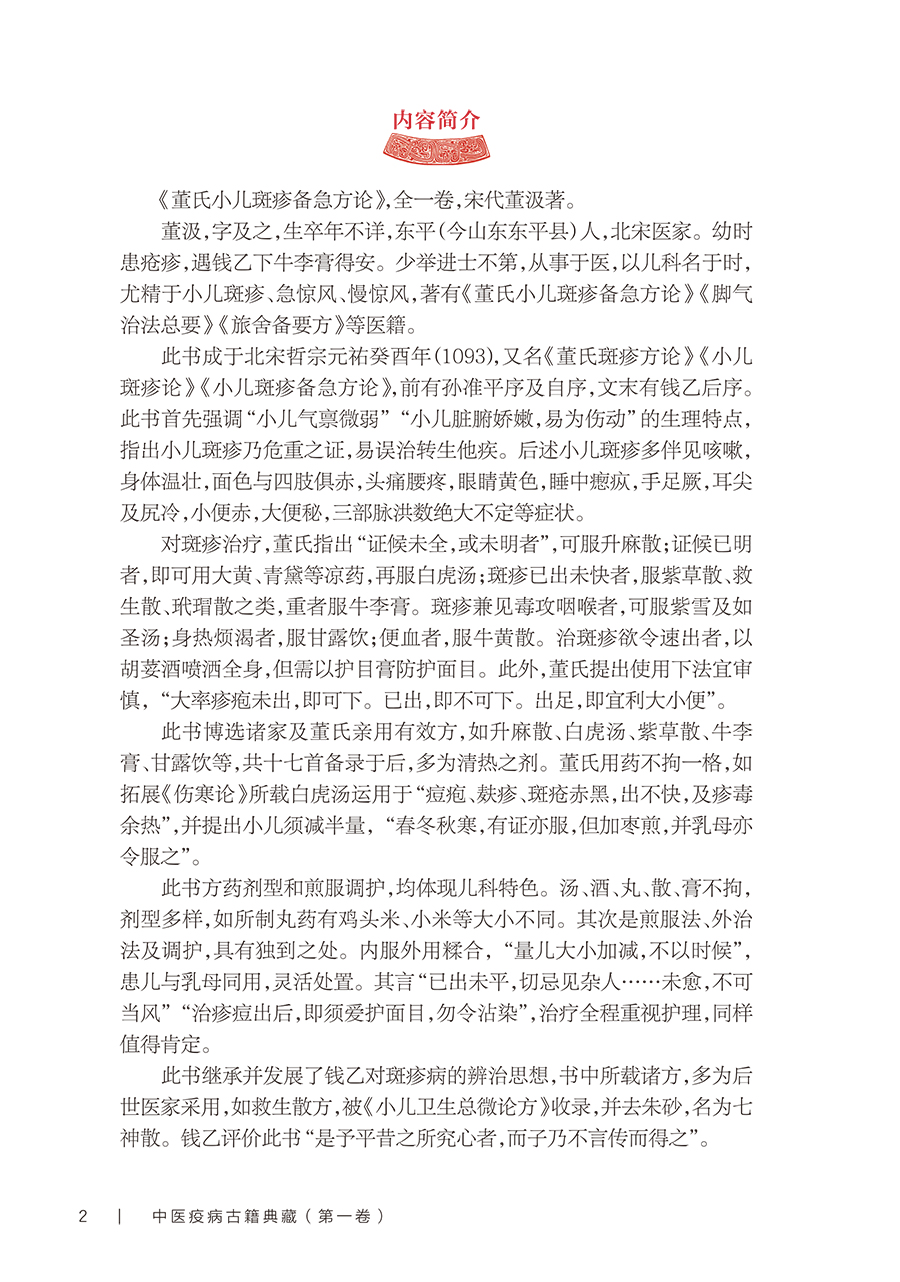 《中医疫病古籍典藏》共四卷,首次将40余种中医古籍论述疫病的专著及综合性古籍中的疫病专篇,进行系统整理、点校注释,以探索中医历代抗疫规律,形成知识体系,总结抗击疫病的经验,更好地为当今各类传染病的中医防治提供借鉴。本书系《中医疫病古籍典藏》的第一卷,共选疫病古籍10种,分别是:《董氏小儿斑疹备急方论》《陈氏小儿痘疹方论》《闻人氏痘疹论》《岭南卫生方》《十药神书》《疠疡机要》《瘴疟指南》《痰火点雪》《霉疮秘录》《温疫论》。这些古籍专著都是中医疫病学从萌芽兴起到逐步独立过程中的重要奠基性文献,对于保护和整理中医疫病早期古籍文献、全面了解和梳理中医对于各类疫病认知的发展脉络,具有重要意义,对当代中医药临床工作具有较大的指导意义,具有重要学术价值、实用价值和文献价值。本次点校采取了简体横排的形式,并进行必要的注释说明,将有利于提升本书对于临床医生、中医学子的可读性和实用性。
