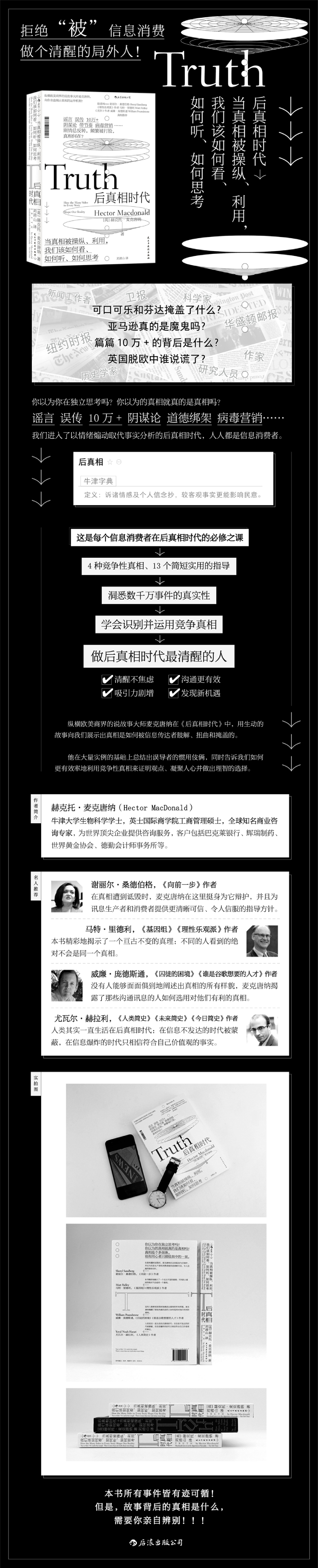 2016年英国公投脱离欧盟,特朗普当选美国总统,一时间,“后真相”成为全民讨论的热点,并被《牛津大辞典》选为年度词汇。所谓“后真相”,就是真相和逻辑在信息传播的过程中被忽视,而情感煽动主导舆论的情形。从投票选举到众筹诈骗,再到病毒营销,无论是在政治、传媒,还是商业领域,后真相的案例俯拾即是。显然,我们已经进入了后真相时代。在本书中,为世界很好企业提供商业咨询的说故事大师赫克托·麦克唐纳用生动的故事向我们展示出真相是如何被信息传达者肢解、扭曲和掩盖的。他在大量实例的基础上总结出误导者的惯用伎俩,同时告诉我们如何更有效率地利用竞争性真相来证明观点、凝聚人心。作为后真相时代的信息消费者,上当受骗有时在所难免。唯有洞悉真相的运作模式,我们才能更有智慧地处理信息,甚至通过改善真相的讲述方式达成目标。