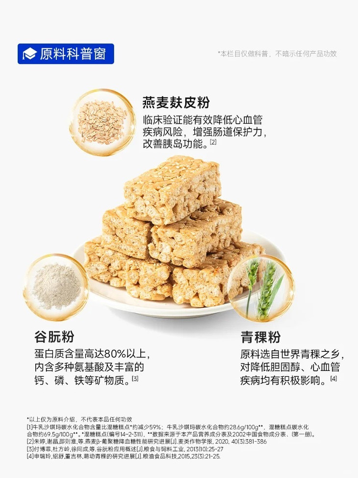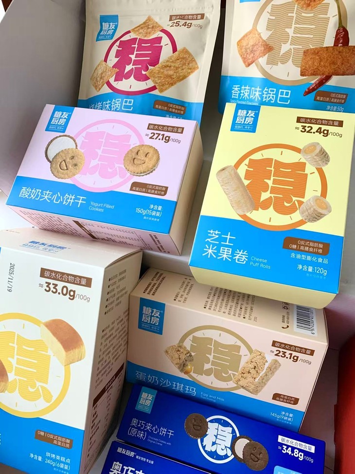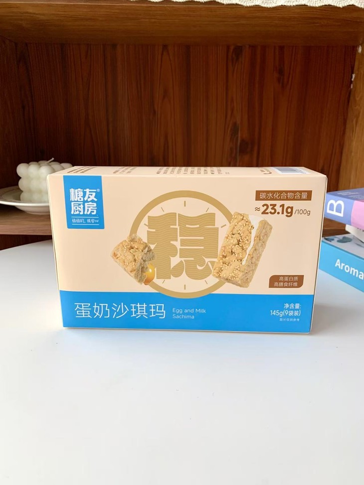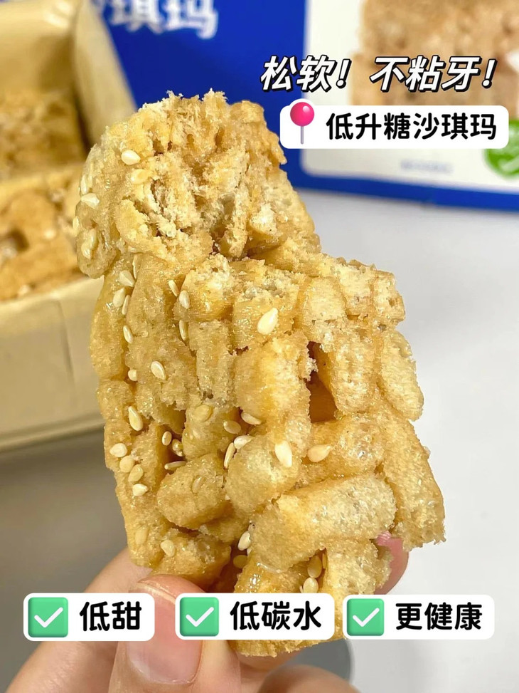 4️⃣【糖友厨房蛋奶沙琪玛】 ✅用料天然营养: 青稞粉、燕麦麸皮粉、大豆分离蛋白,搭配益生元(聚葡萄糖+低聚异麦芽糖),饱腹感足,还能呵护肠道健康! ✅低碳水高纤维配方 0添加白面粉,0添加蔗糖,碳水含量比普通沙琪玛减少67%! 控糖期也能安心吃~
