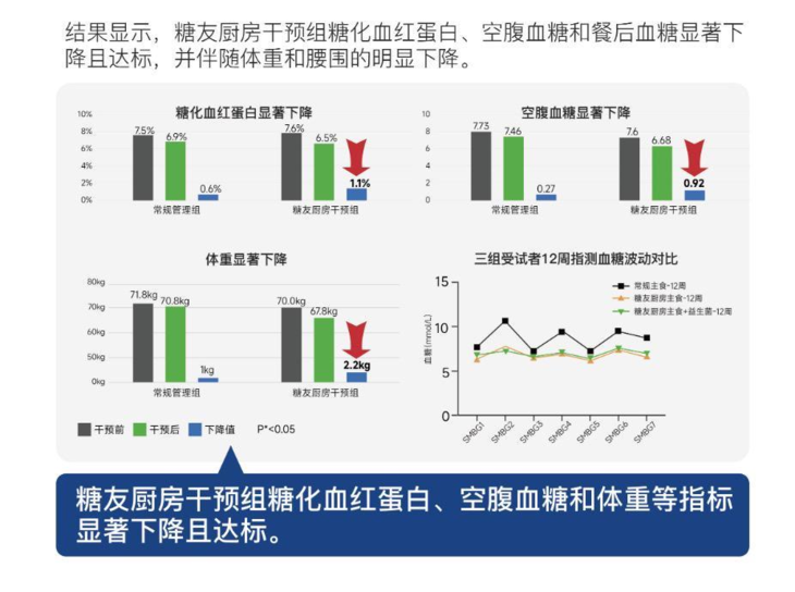 👇三甲医院权威认证 3 个月随机对照临床实验结果显示 糖友厨房干预组血糖、体重、腰围明显下降