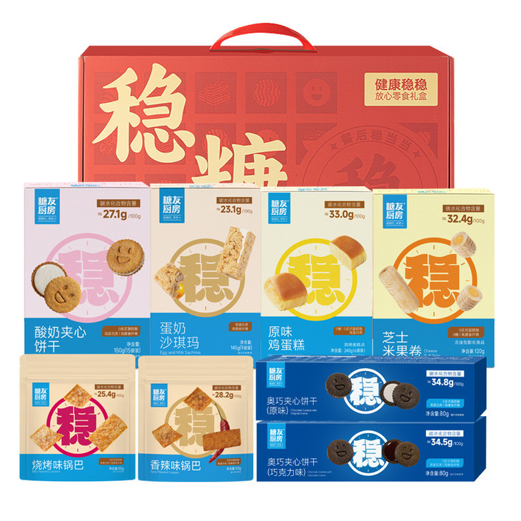 【糖友厨房零食大礼包】 915g 满满一大箱,一开箱直接被拿捏✨ ➡️酸奶夹心饼干 ➡️芝士米果卷 ➡️香辣 / 烧烤锅巴 ➡️蛋奶沙琪玛 ➡️奥巧夹心饼干 ➡️原味鸡蛋糕 整整 6 款零食,甜咸党都能满足!
