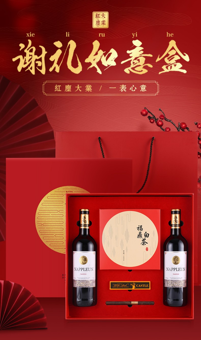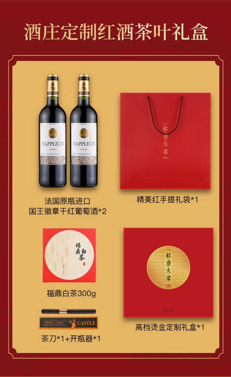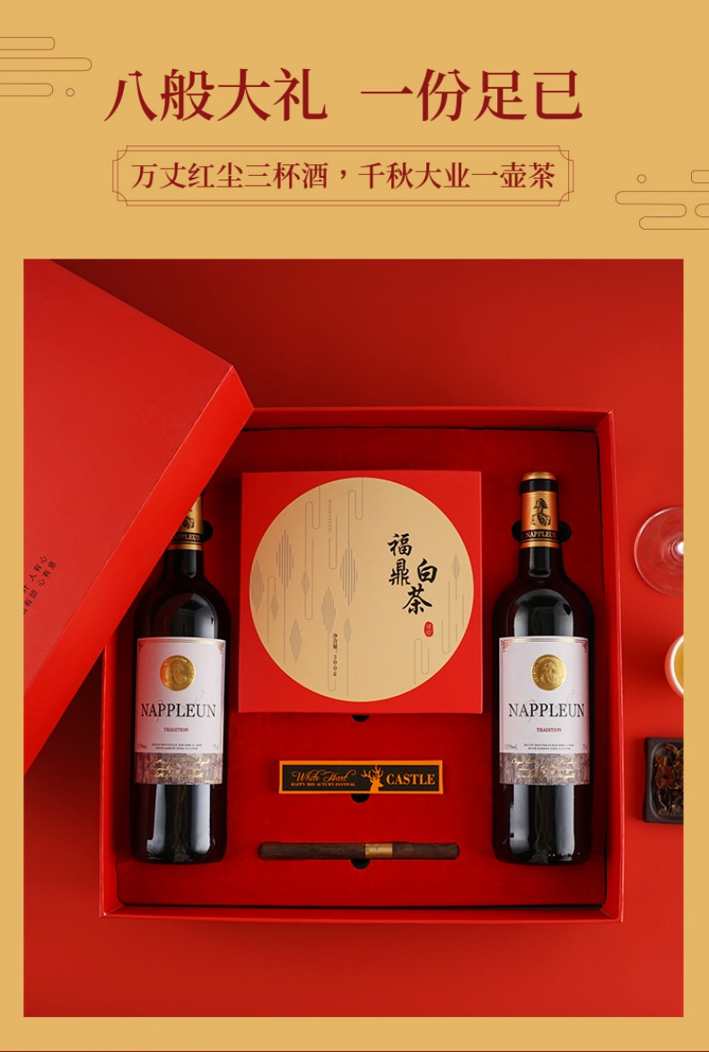 抢高端定制茶酒礼盒【国王徽章干红茶饼礼盒】2支法国原瓶进口·干红葡萄酒🍷➕1块正宗福鼎白茶