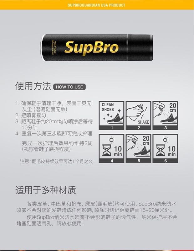 2.将 SupBro 喷于鞋面两遍,第一遍:清洁鞋面后, 在距离鞋面 20cm 处喷洒均匀, 放置 10 分钟