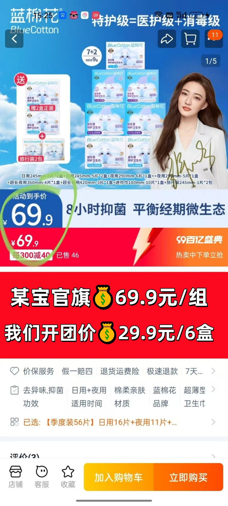 蓝棉花小新翼日夜周期组合卫生巾 ② 最关心的还是价格[捂脸] 现在市面上的好多姨妈巾都塌了,这款是医护级看着更有保障一点 我看着包装还不错,挺好看的 线上线下都卖的火爆的【蓝棉花医护级卫生巾】!!! 一包就要十几块!! - 超市最贵!!日积月累真的要花好多钱!!每个月买姨妈巾都要花小一百了 真的好费钱,但是又不能不用,今天推荐的这款 超值性价比 组合装29.9元🉐 39片 而且还是日夜超值省心装 ,省心 省钱 不用选择 闭眼入!! 卫生巾真的好贵,便宜的小牌子又不敢买 还是买大牌的靠谱。第一次见这种医护级的,看着就很靠谱,