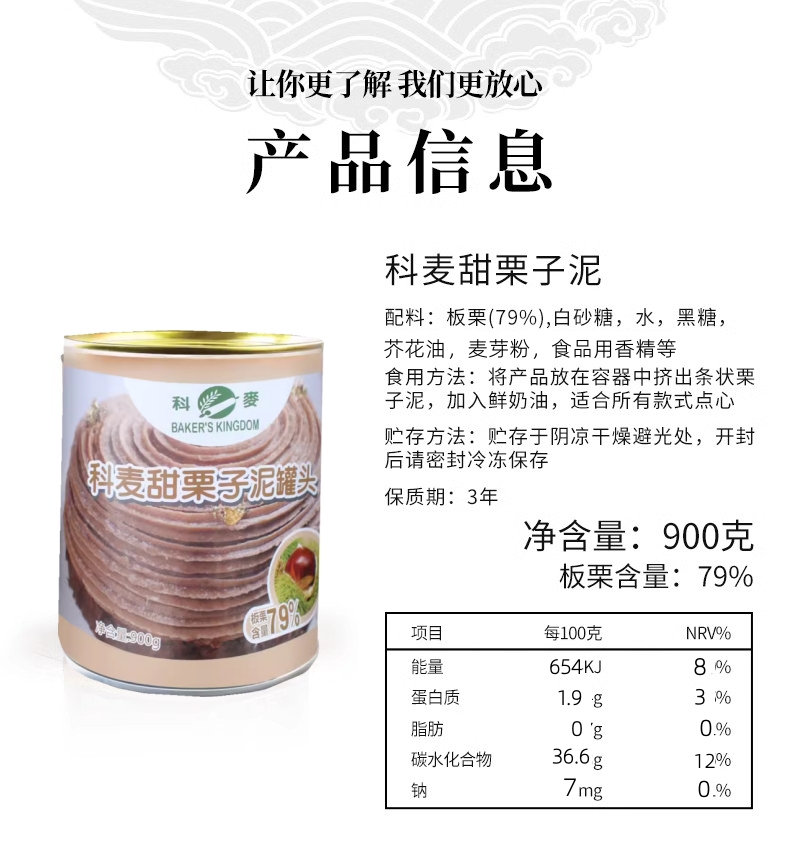 900g 科麦 甜栗子泥罐头 板栗含量79% 面包馅蒙布朗蛋糕西点装饰