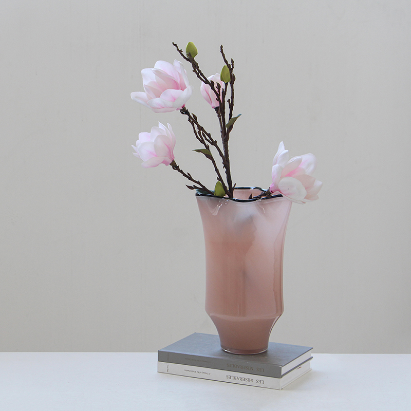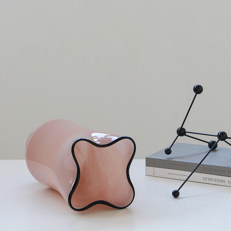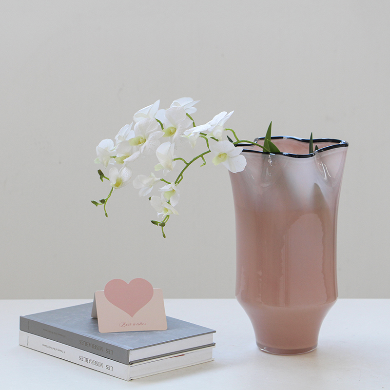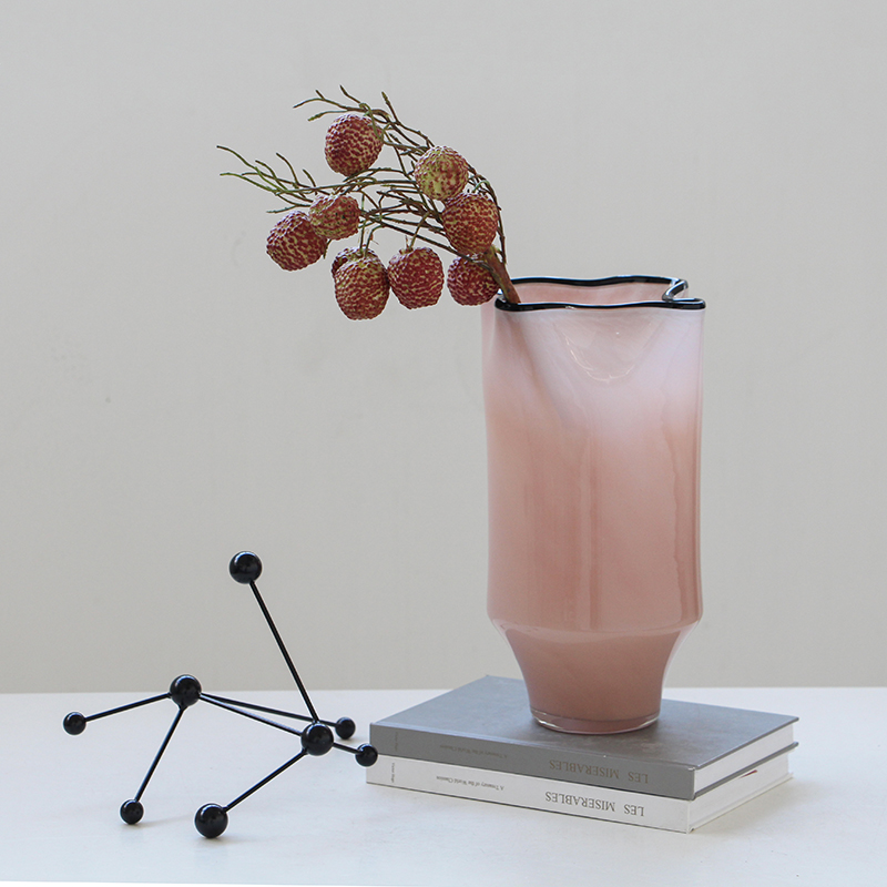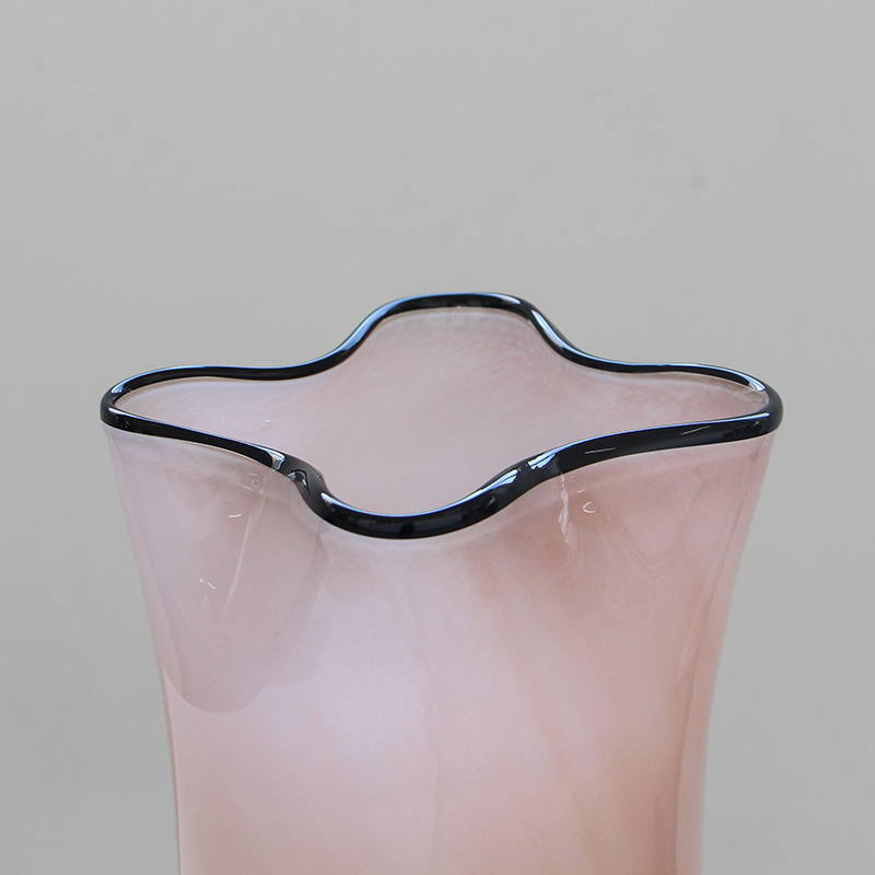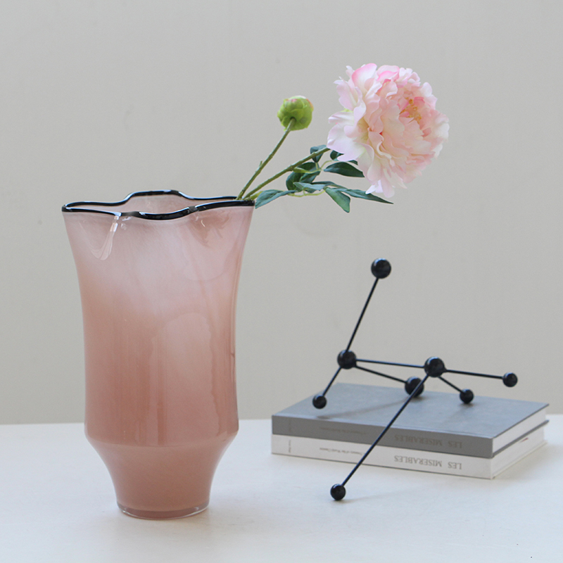 碧轩玻璃批发北欧风中黑边创意褶皱手工大口瓷粉花瓶玄关居家花瓶