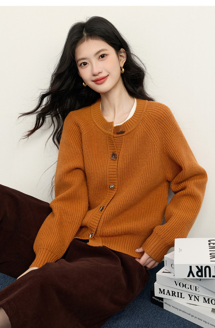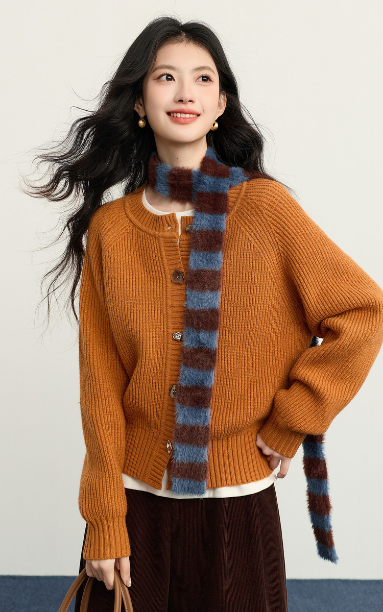 【年货节】熙世界韩系穿搭橘色毛衣开衫女秋冬厚款高级感圆领坑条针织短外套