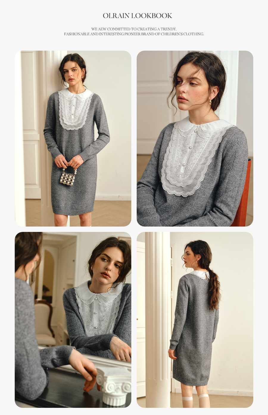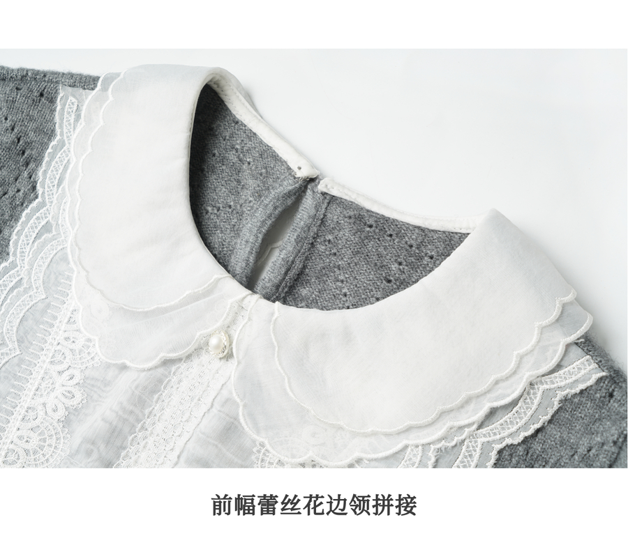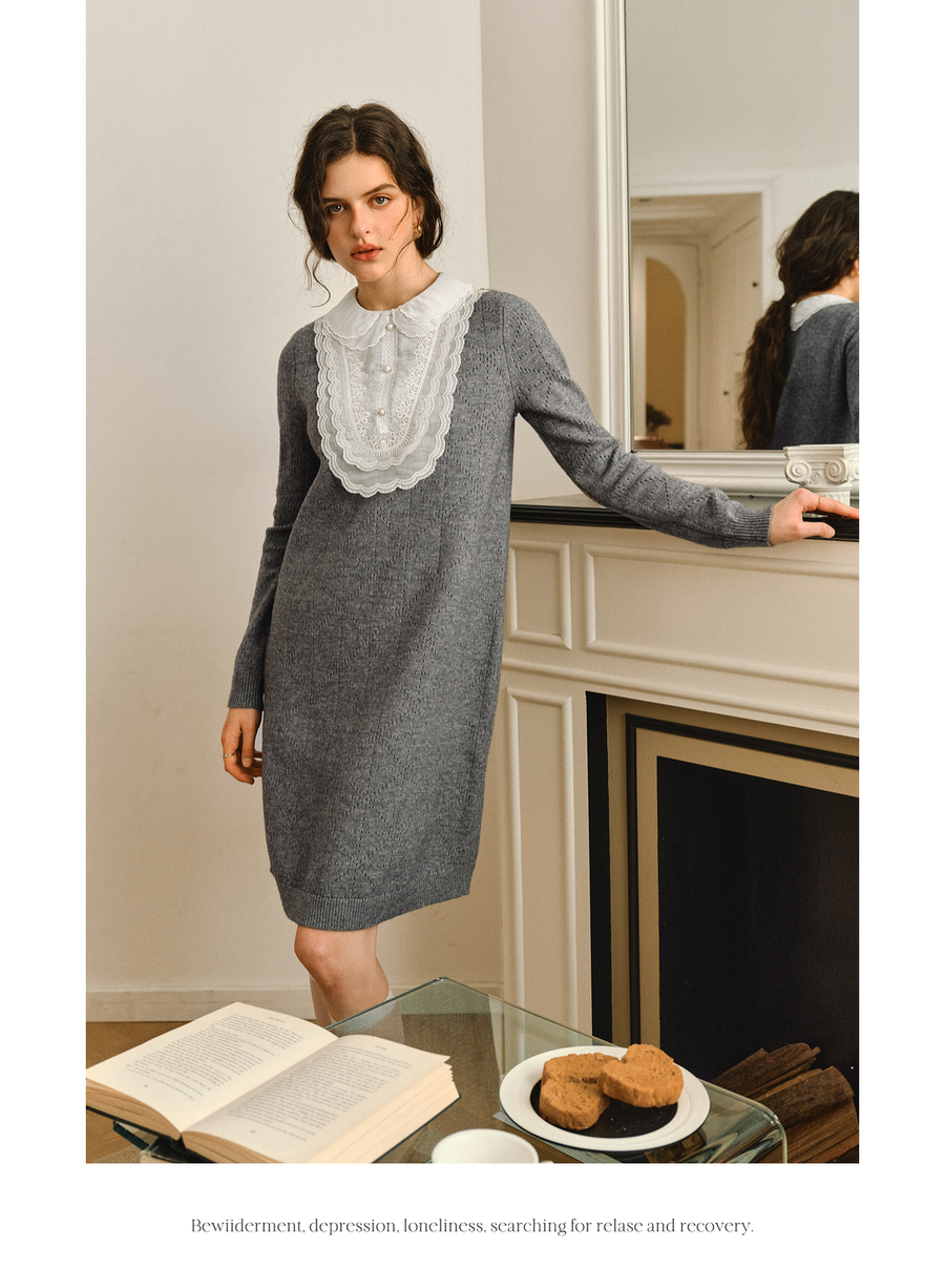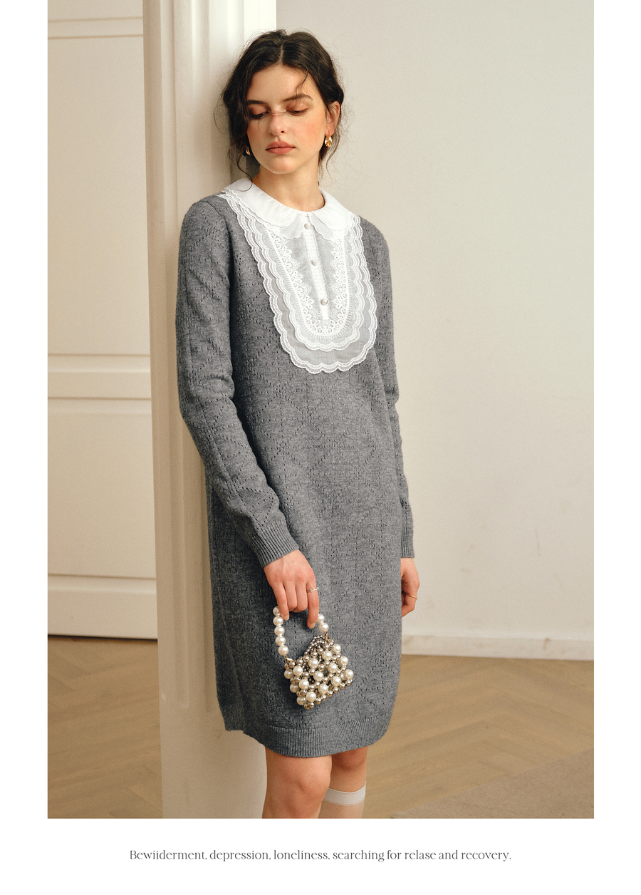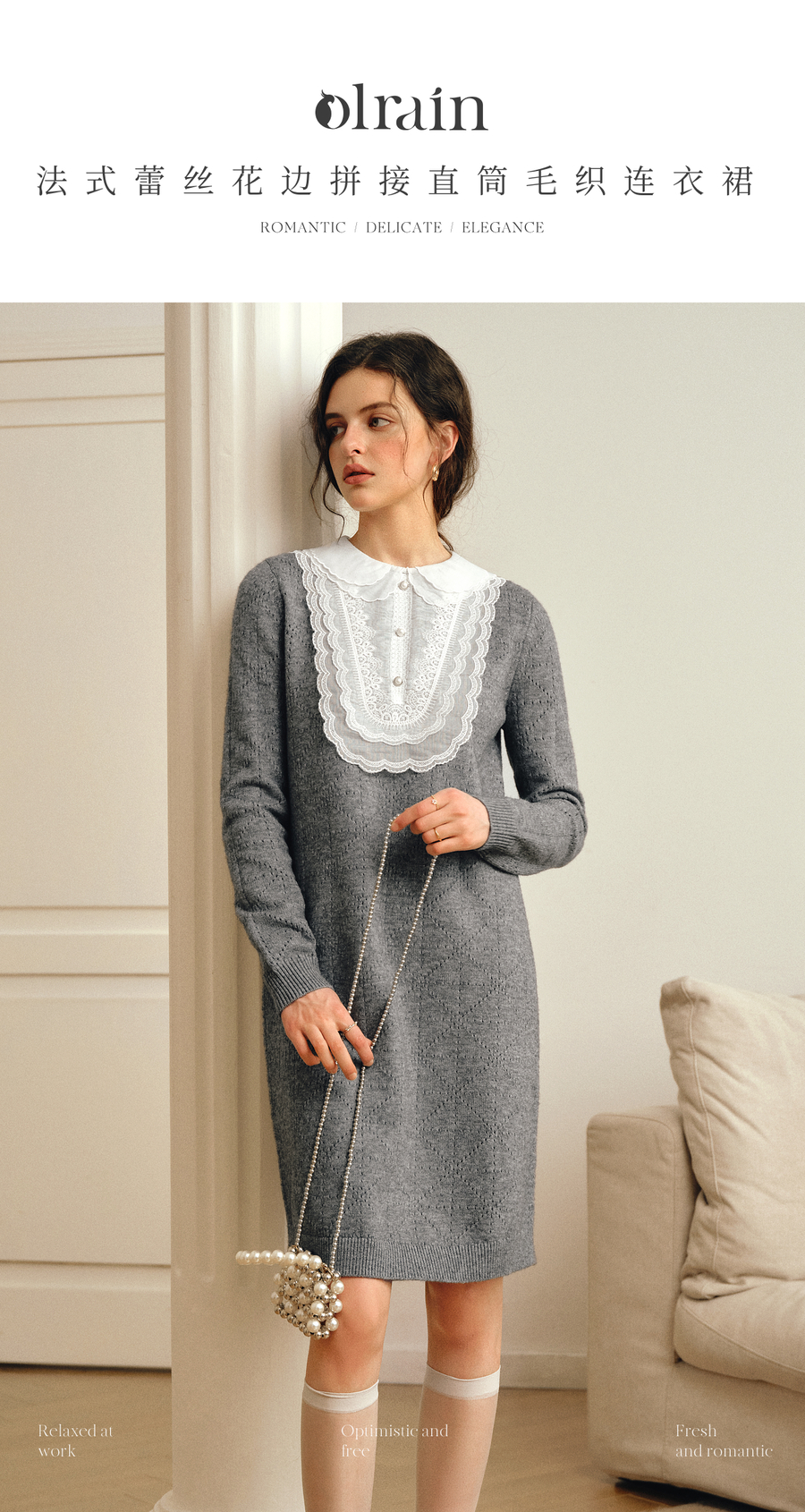 OLrain欧芮儿2025新款女秋季灰色法式蕾丝花边拼接直筒毛织连衣裙