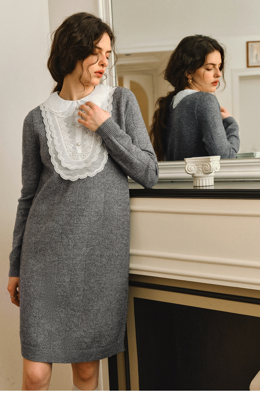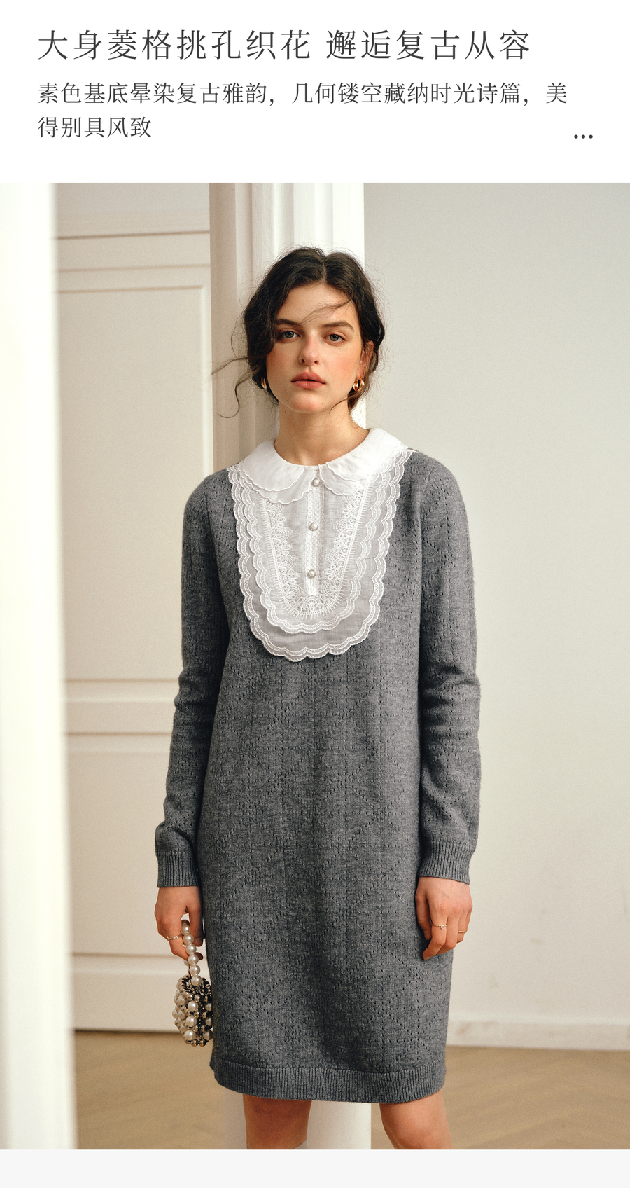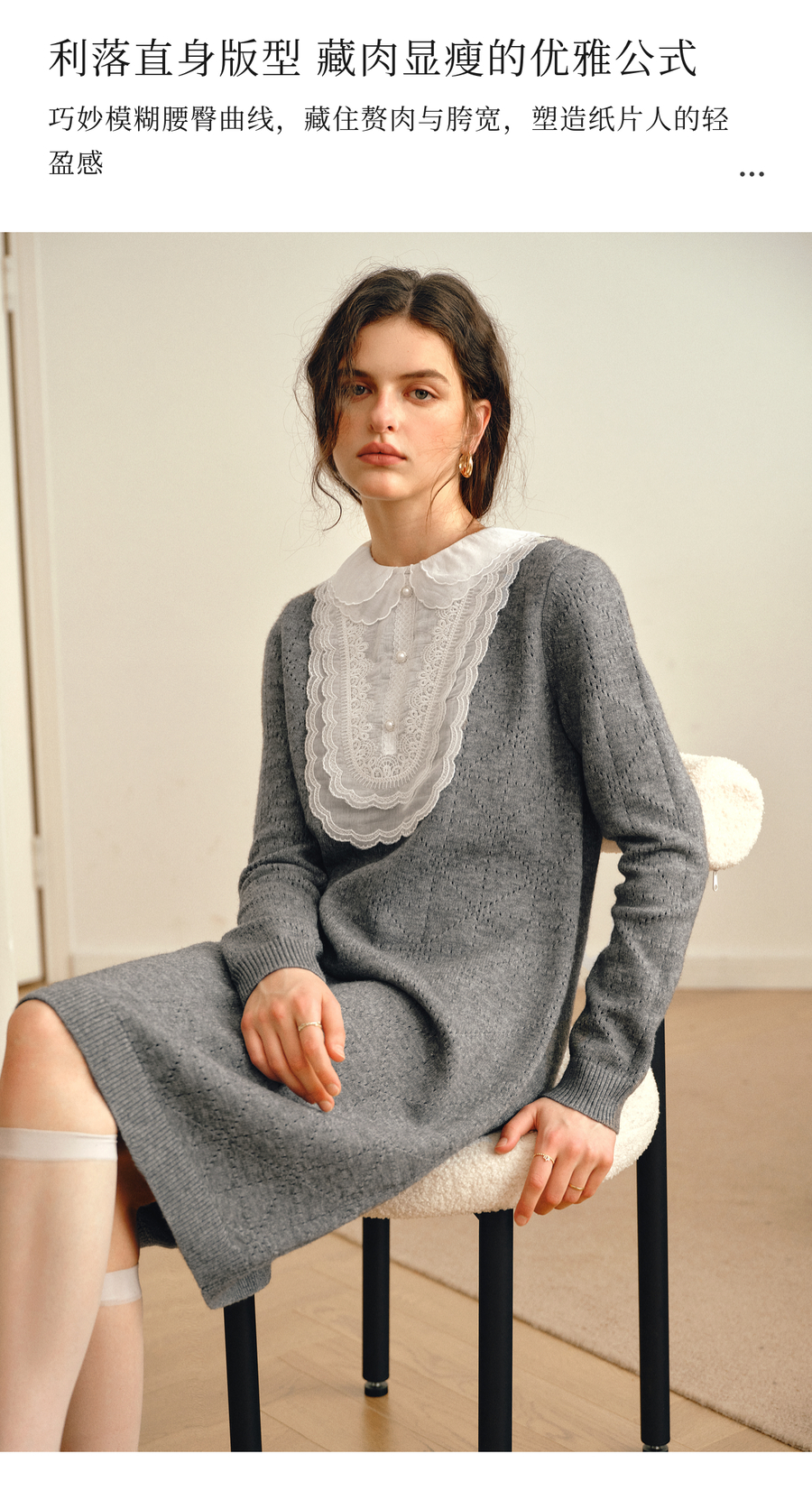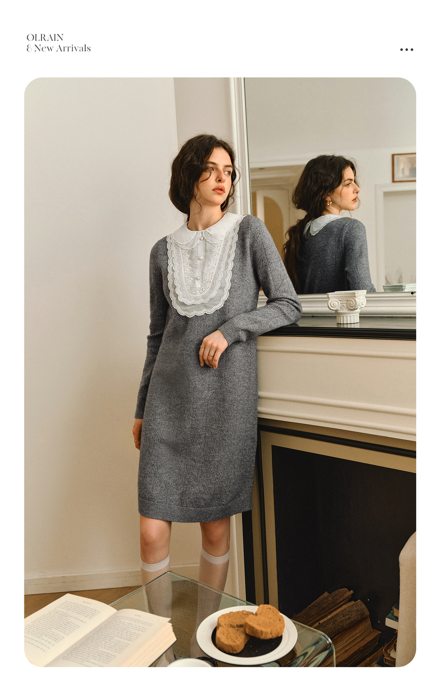 OLrain欧芮儿2025新款女秋季灰色法式蕾丝花边拼接直筒毛织连衣裙