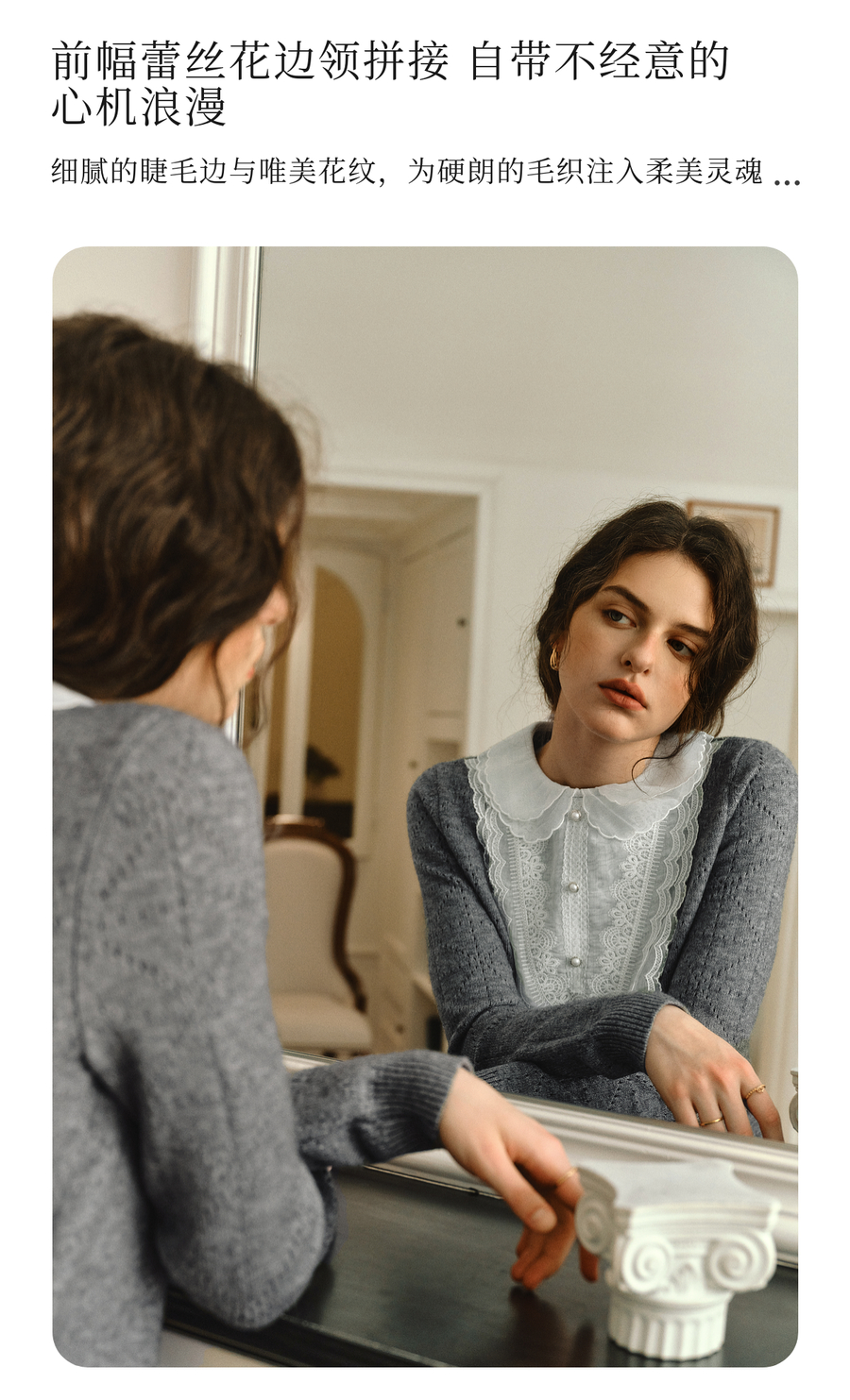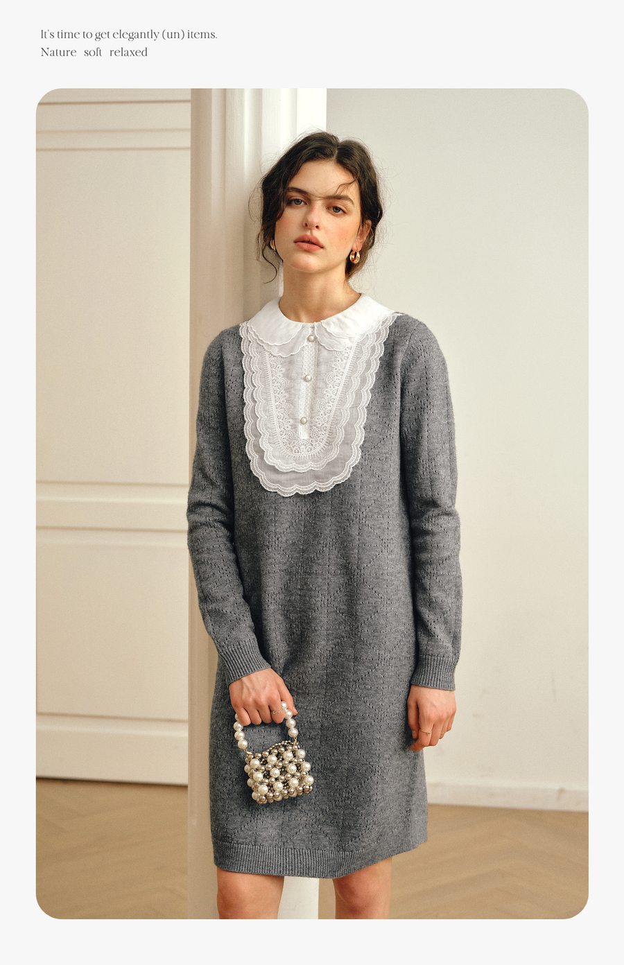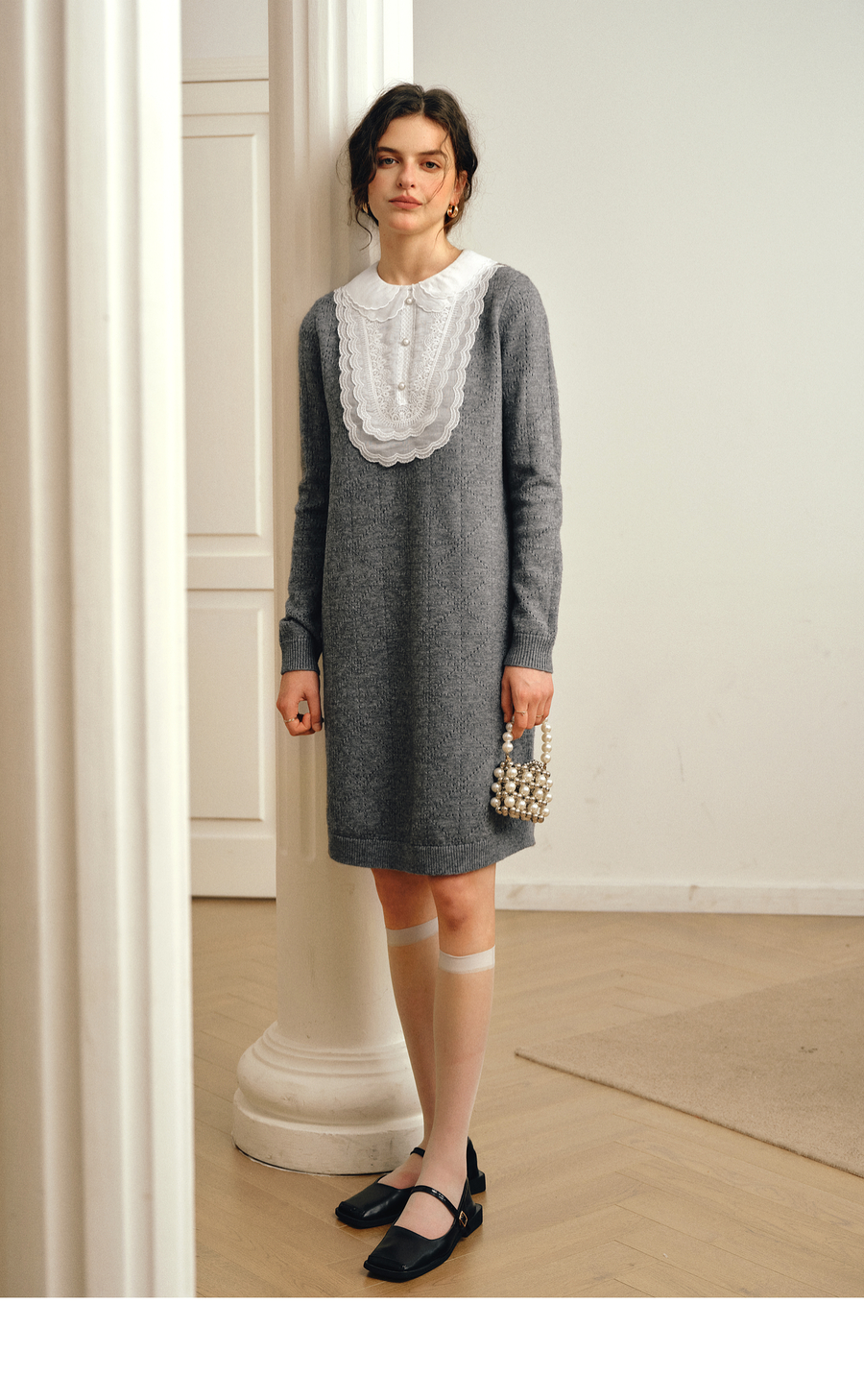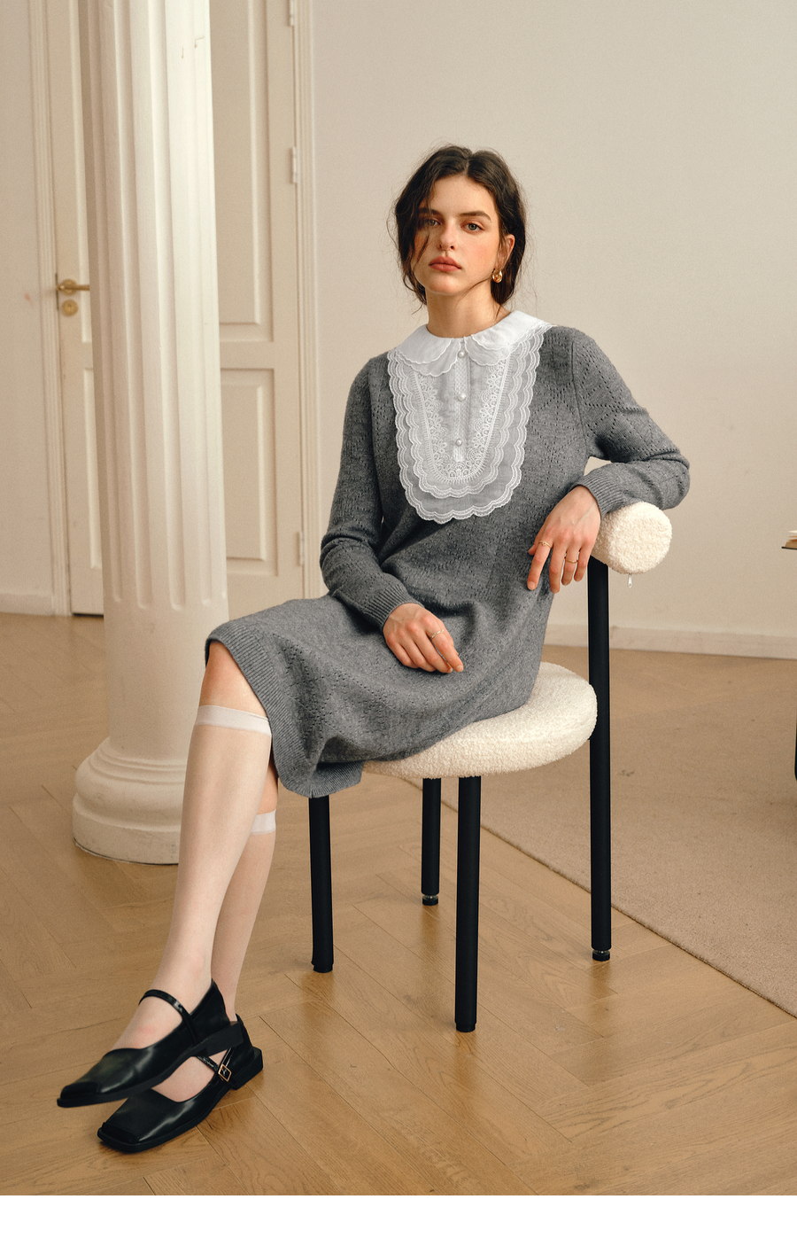 OLrain欧芮儿2025新款女秋季灰色法式蕾丝花边拼接直筒毛织连衣裙