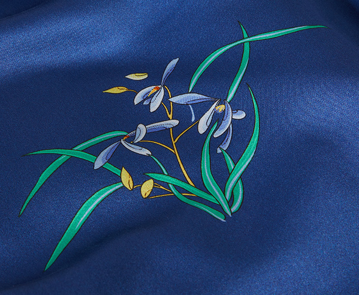 图案设计灵感出自故宫藏品清·桃红色缎绣丛兰飞蝶纹氅衣。"幽兰生前庭,含薰待清风",兰花一直被视为君子的象征,叶态卓越多姿,花朵幽香高洁,脱俗的气质引得历代文人墨客为之倾醉,同时广泛应用于氅衣服饰、瓷器以及装饰物件之中。