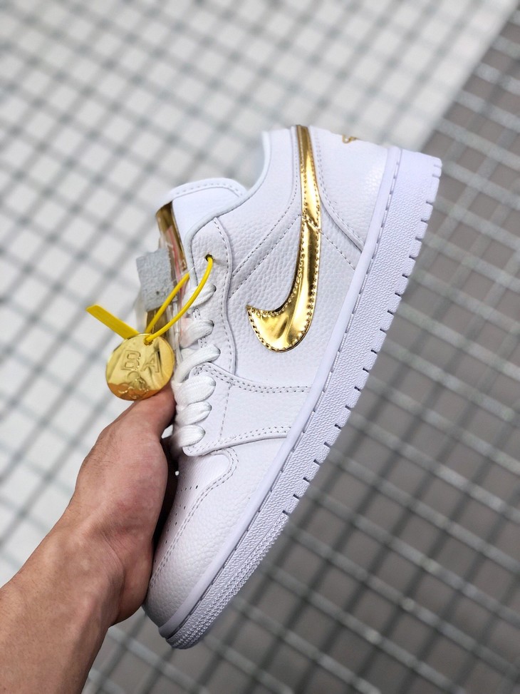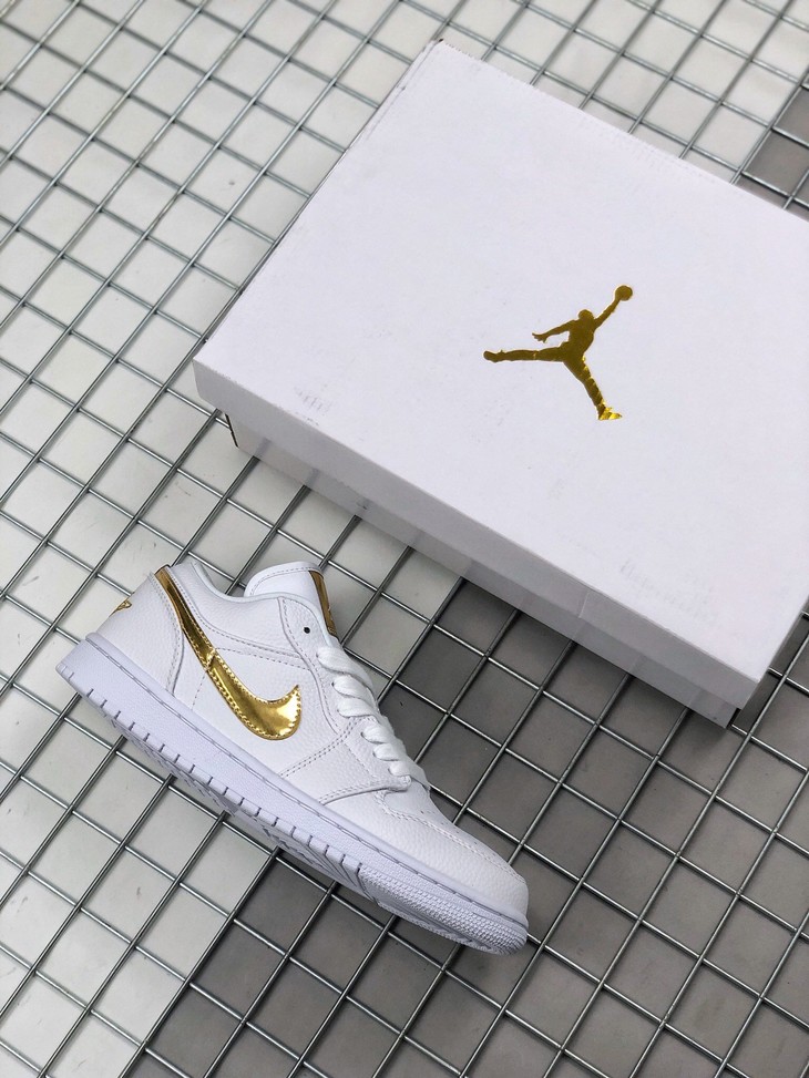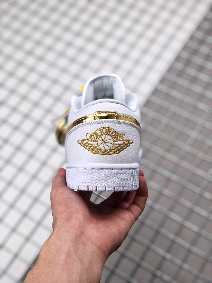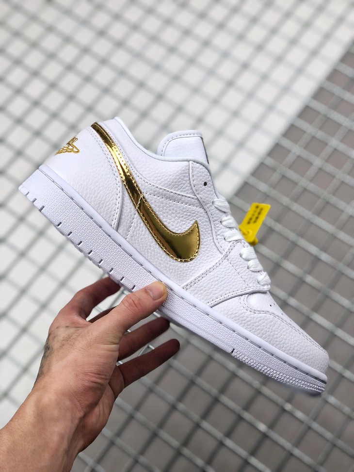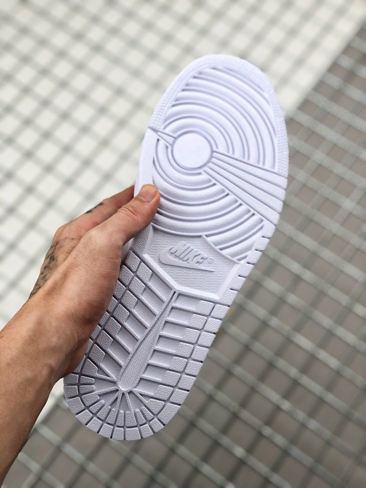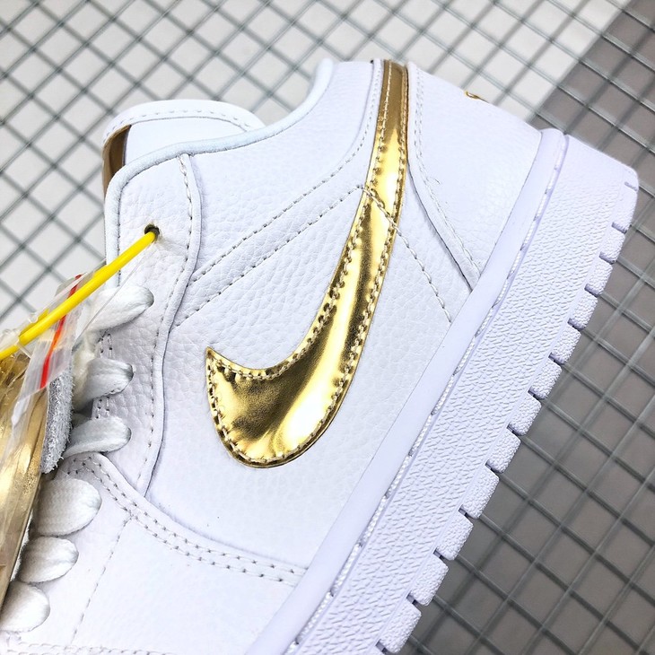Air Jordan 1 Low 白金 整体选用白色皮革构建低筒鞋身,优质荔枝皮的呈现让其颇具质感