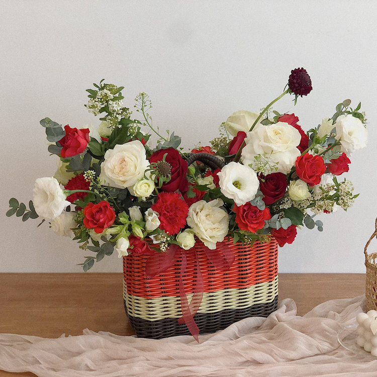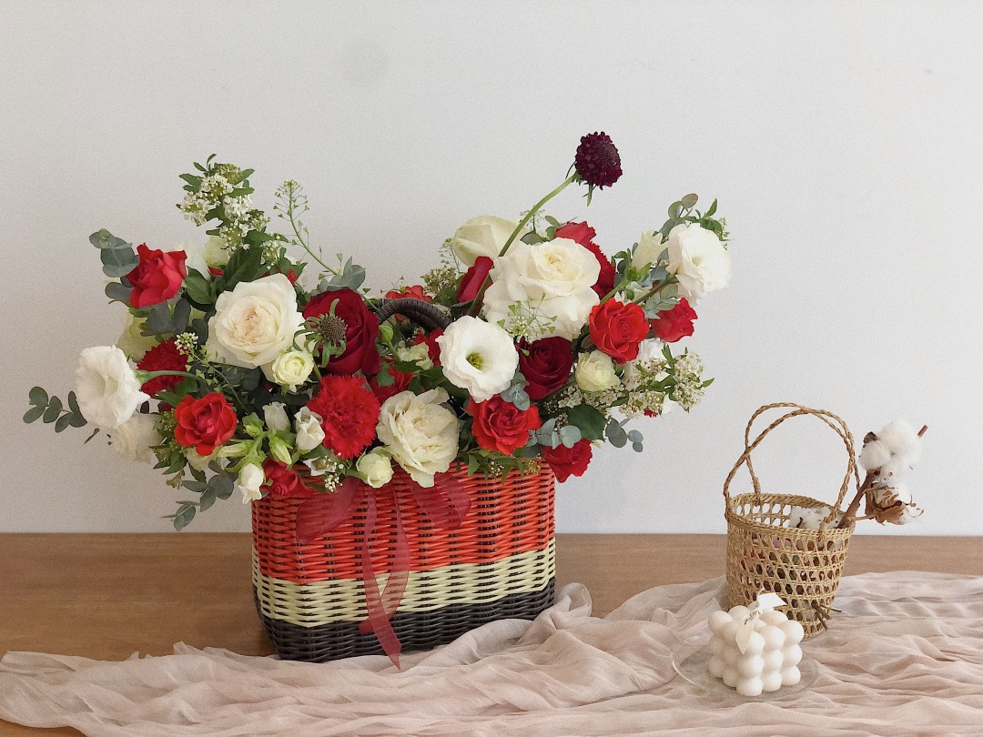 用花园玫瑰、风铃花妆点一篮子的诗意