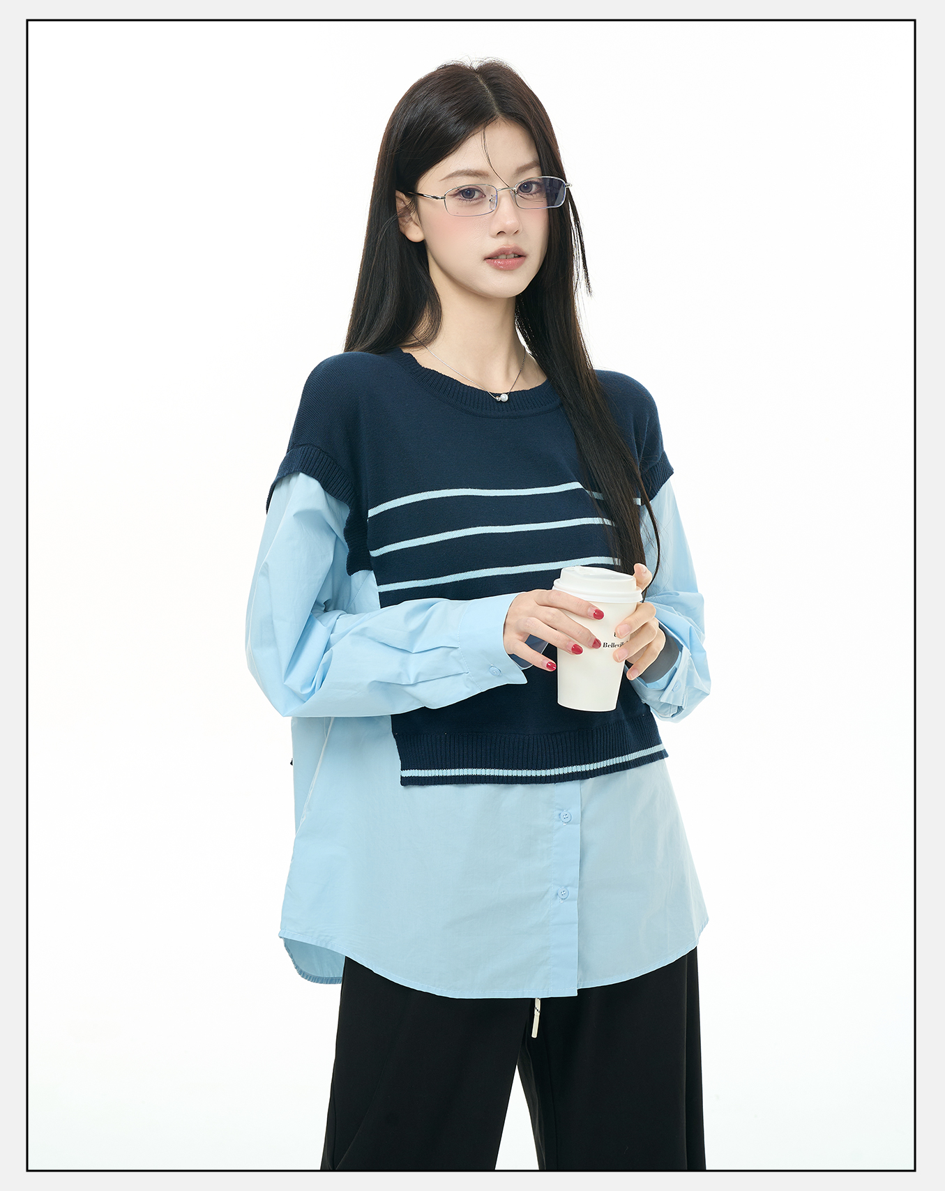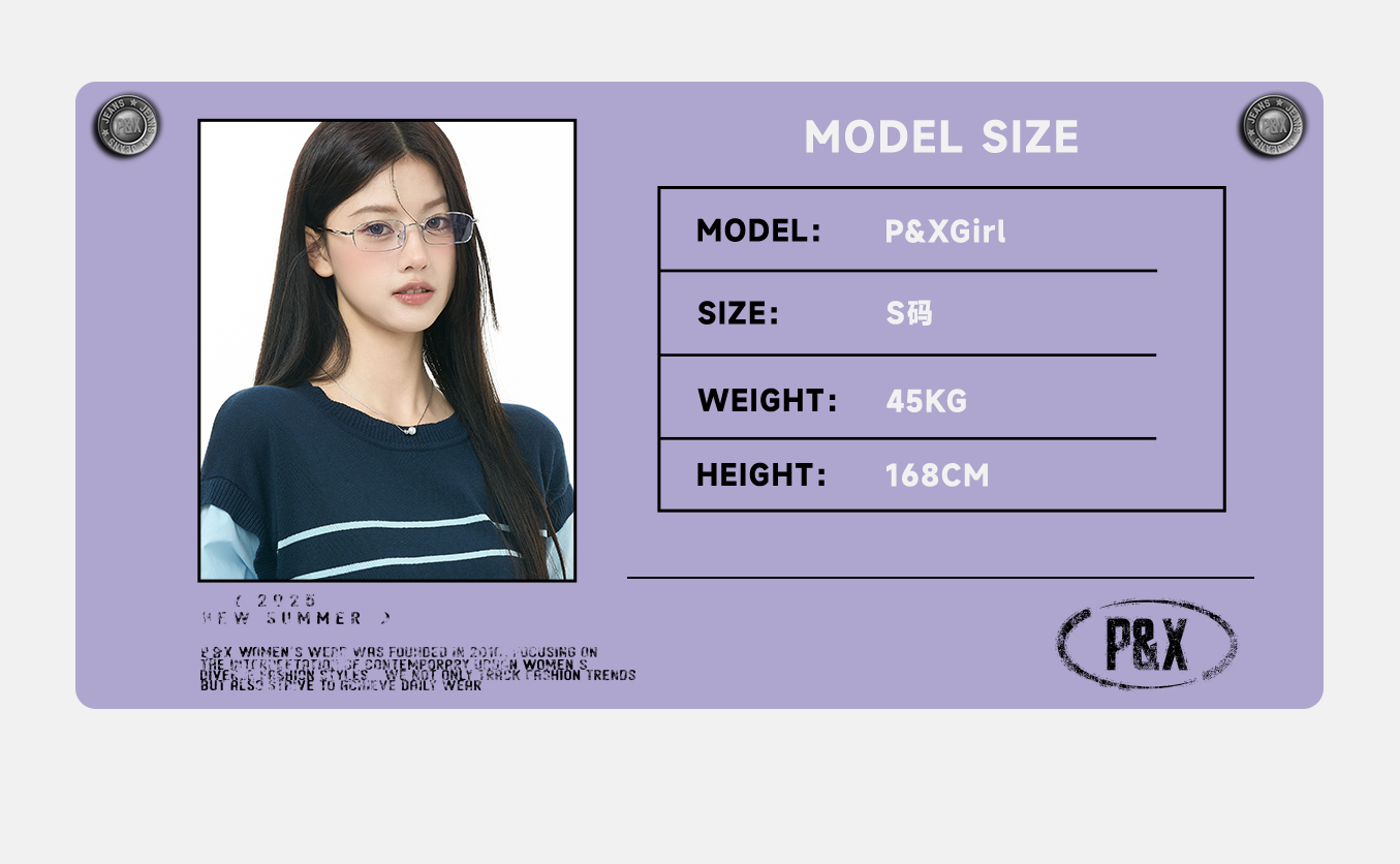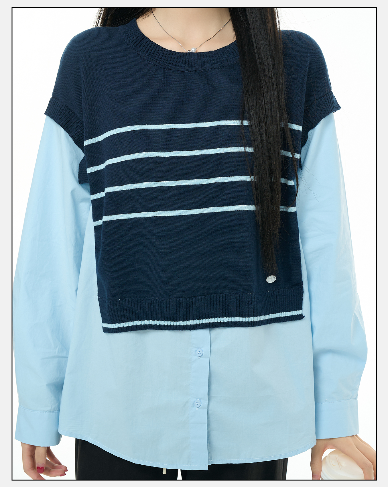 P&X设计师女装2025秋季圆领假两件拼接毛针织衫825331106 蓝色