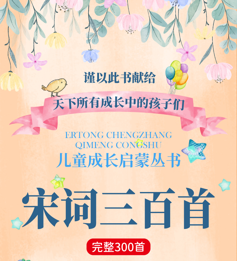 宋词是中华文化的瑰宝,闪烁着耀眼的光芒。本书从众多宋词中摘录了300首,让孩子在阅读中领略宋词的韵律之美。这些宋词如音乐般优美,让人仿佛置身于古代的画卷之中。这些词中即有“众里寻他千百度,蓦然回首,那人却在,灯火阑珊处”的唯美,又有“怒发冲冠,凭栏处、潇潇雨歇。抬望眼,仰天长啸,壮怀激烈”的豪情。希望小读者在阅读本书时,能深刻体会到当时社会生活的丰富多彩,品味到词人们对于生命和生活的深刻思考。