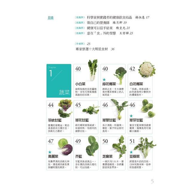 本書介紹各類健康食材:蔬菜、穀類、豆類、水果類、堅果與種子類、大豆類、乳製品,肉、禽、蛋類,魚類與海鮮,