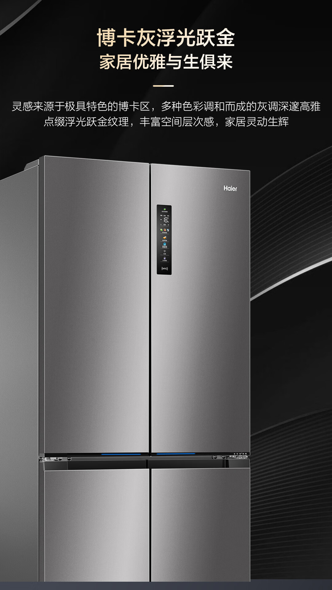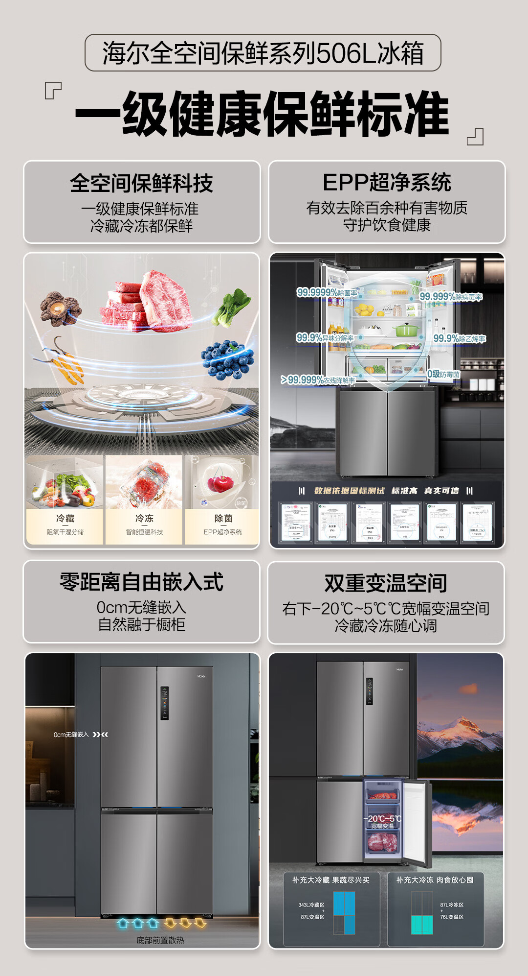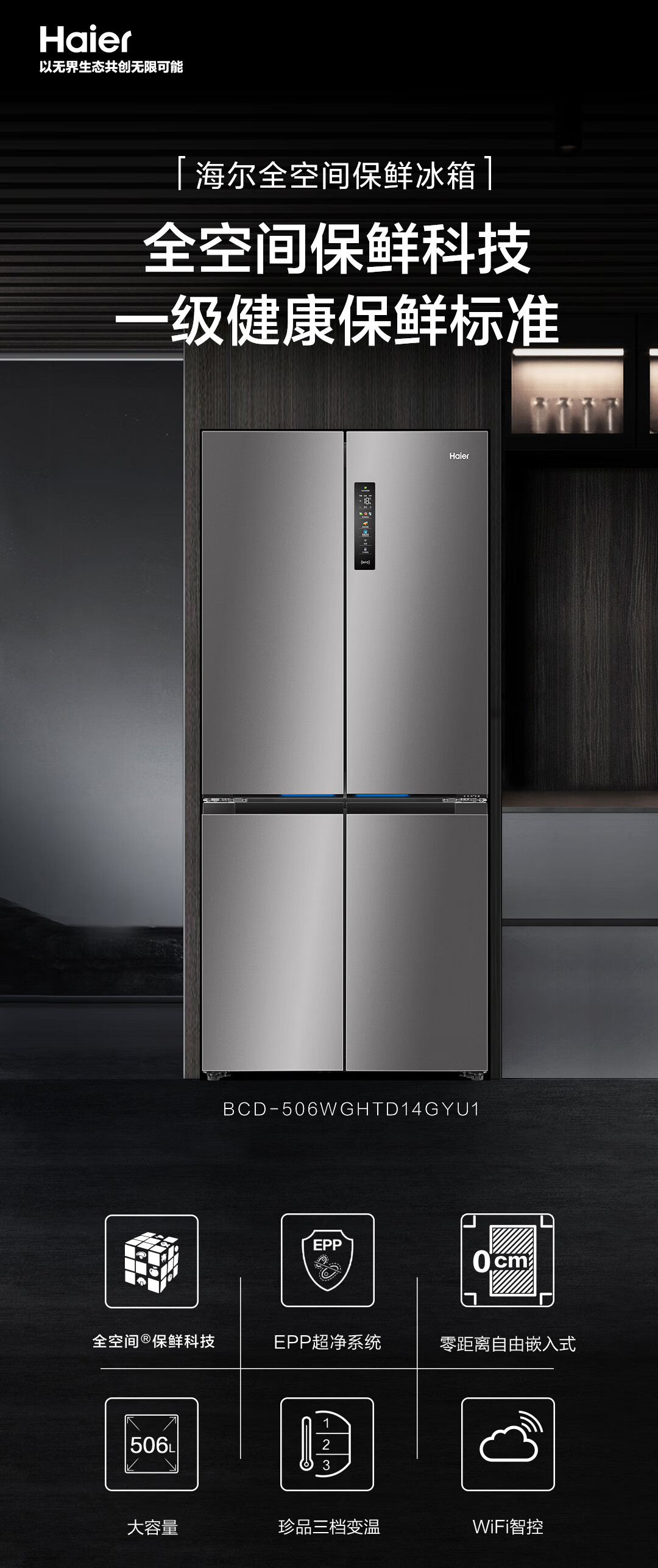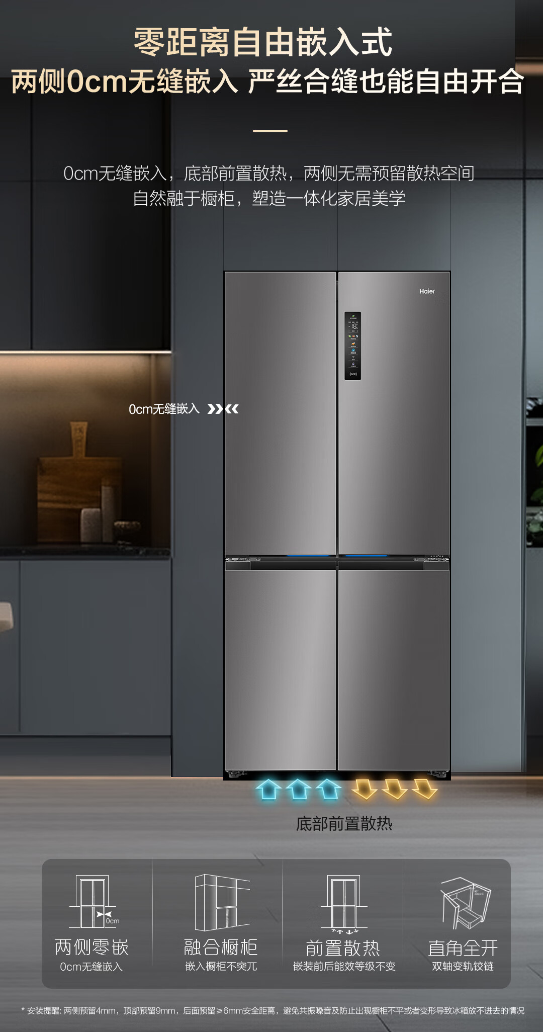 海尔(Haier)506升全空间保鲜零距离自由嵌入式十字四门电冰箱家用风冷一级能效BCD-506WGHTD14GYU1灰