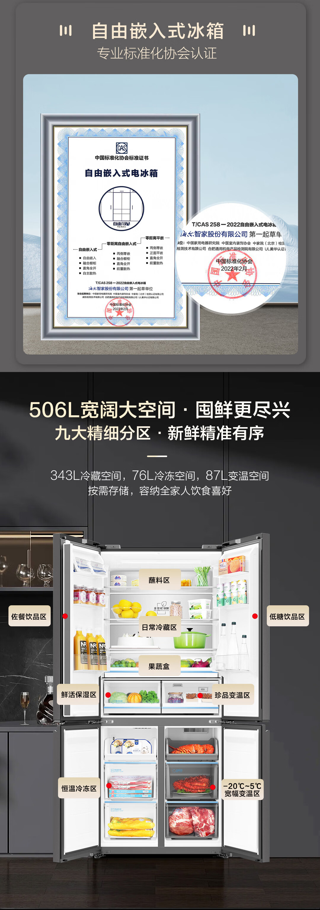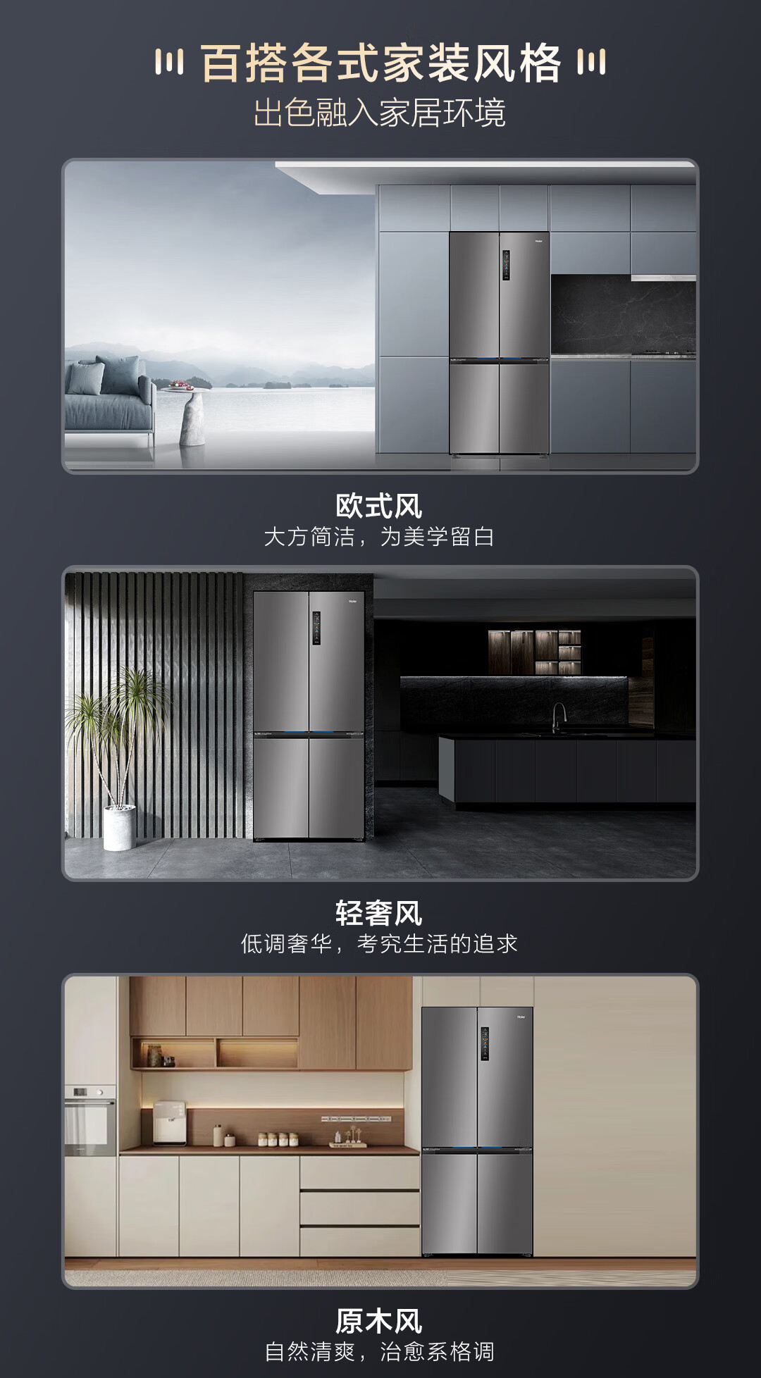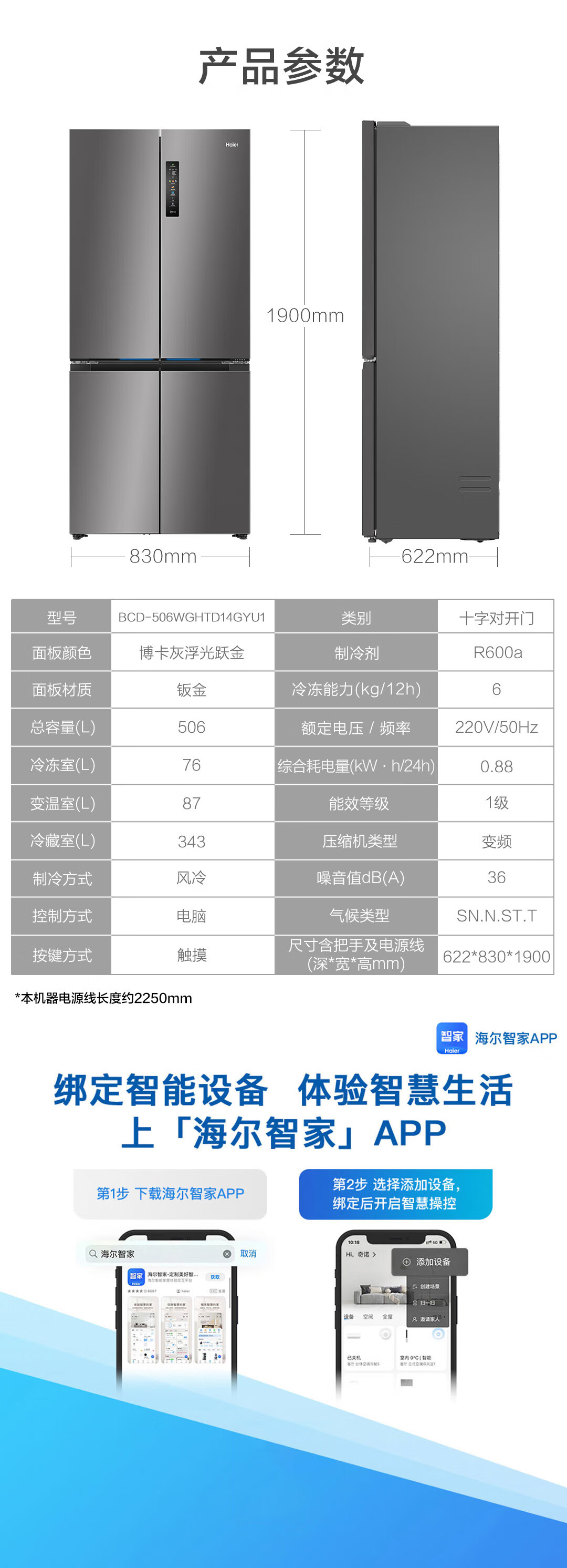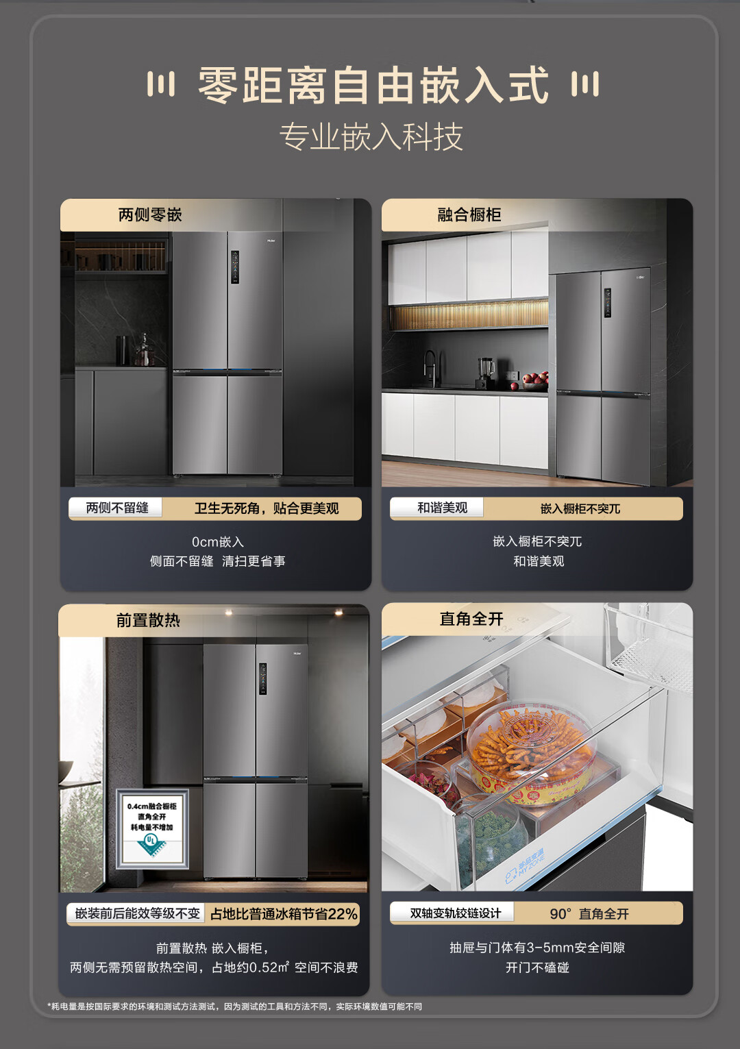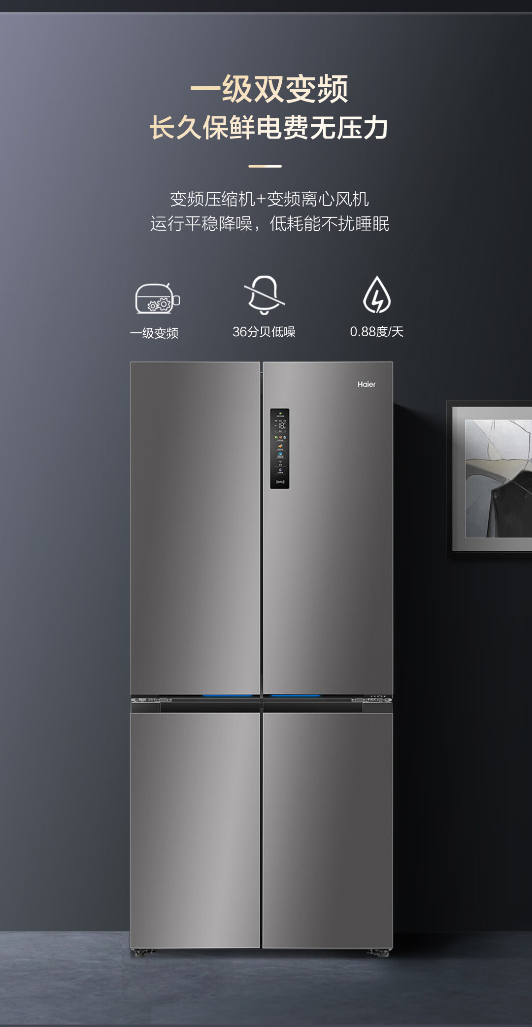 海尔(Haier)506升全空间保鲜零距离自由嵌入式十字四门电冰箱家用风冷一级能效BCD-506WGHTD14GYU1灰