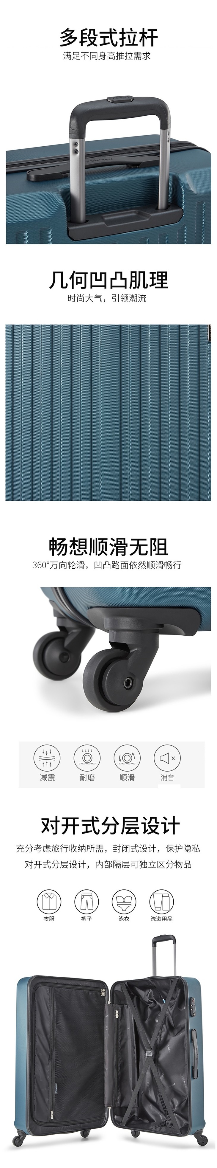 箱体主要材质ABS+PC 耐磨纹路材质设计 时尚炫酷 设计感满满 箱子回弹性能好好,真的不易变形变色 箱体抗高温、不变形、耐磨均是行业最高品质 只有大品牌才会用的高标准材料