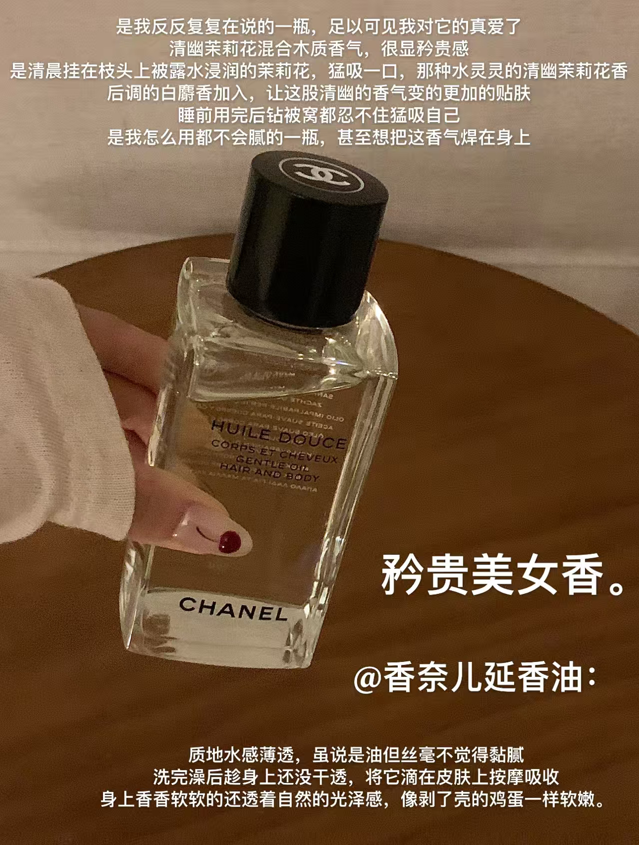 丝滑细腻 不仅可用于身体护理还可以涂抹头发 轻盈滋润由肌肤至发丝 可搭配任意香水 有效延香及丰富层次