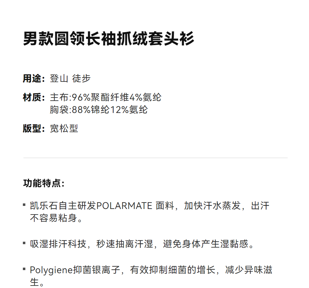 KAILAS凯乐石 男款圆领长袖抓绒套头衫 KG2532110