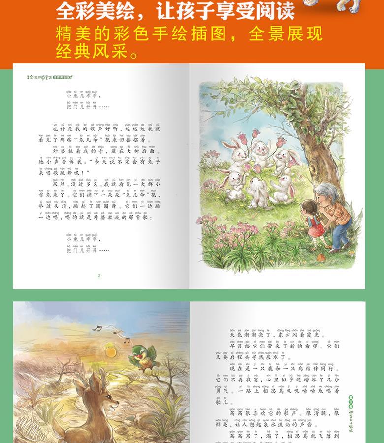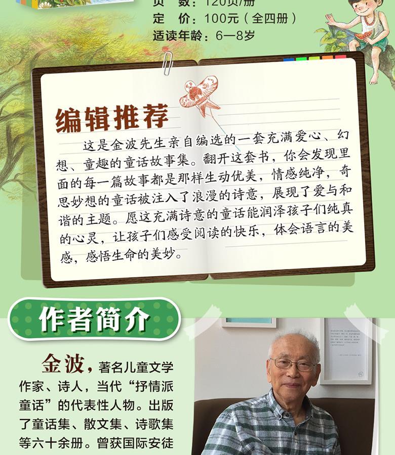 《金波四季童话》是金波先生亲自编选的一套充满爱心、幻想、童趣的童话故事集,收录了作者众多优秀的童话作品,配以精美的彩色手绘插图并标注拼音,按照适龄孩子的接受和理解能力进行编排。这些童话故事以广大的自然界为背景,以一年四季为分类,以自然界中活跃的生灵为主人公,以他们之间的生活故事展开。奇思妙想的童话被注入了浪漫的诗意,展现了爱与和谐的主题,是献给孩子们的美好而有内涵的童话精品。