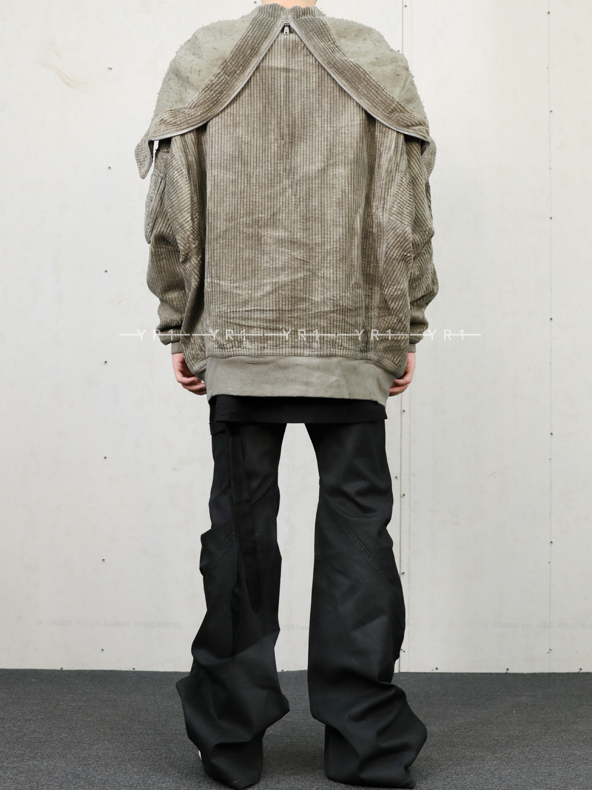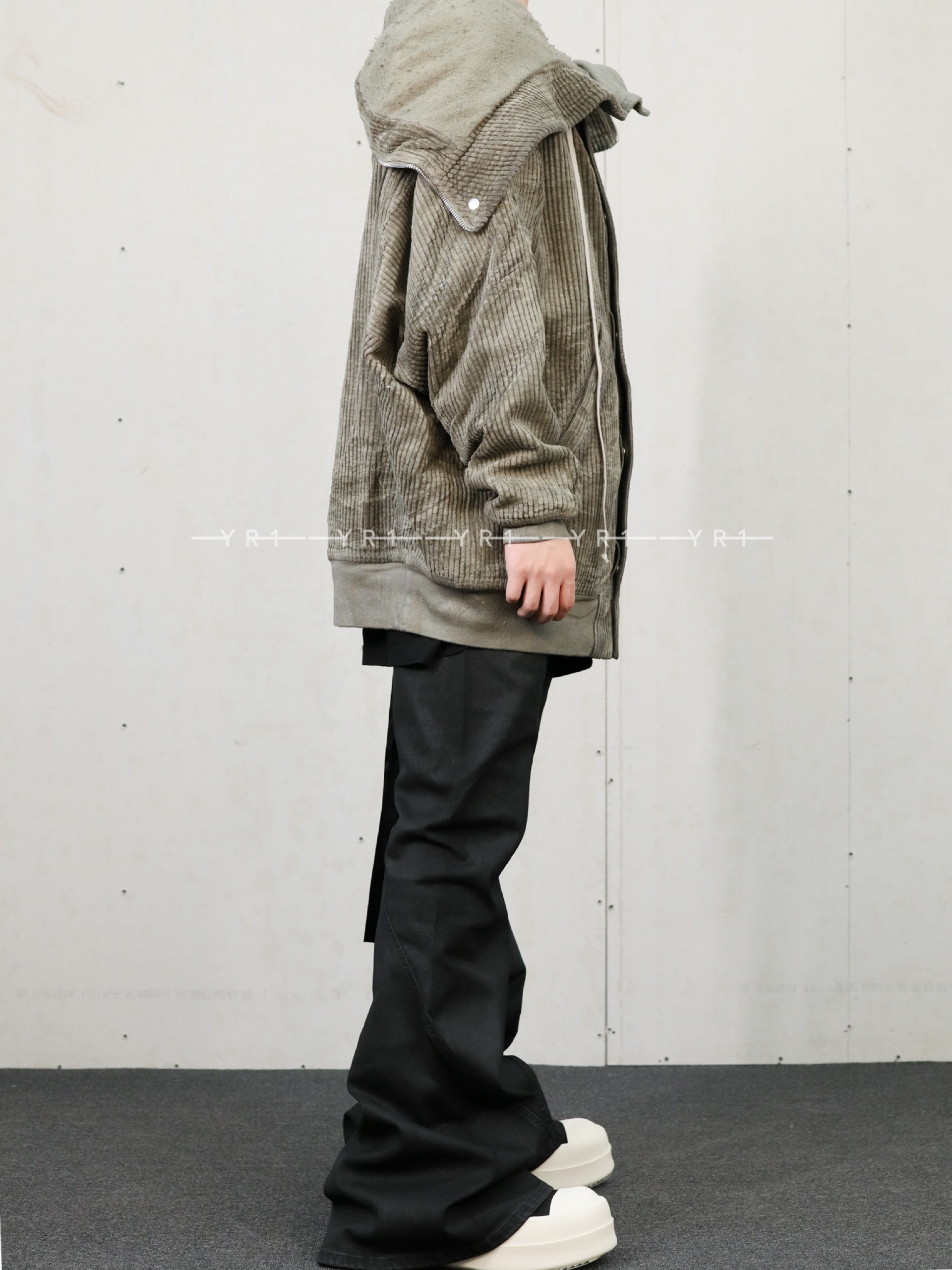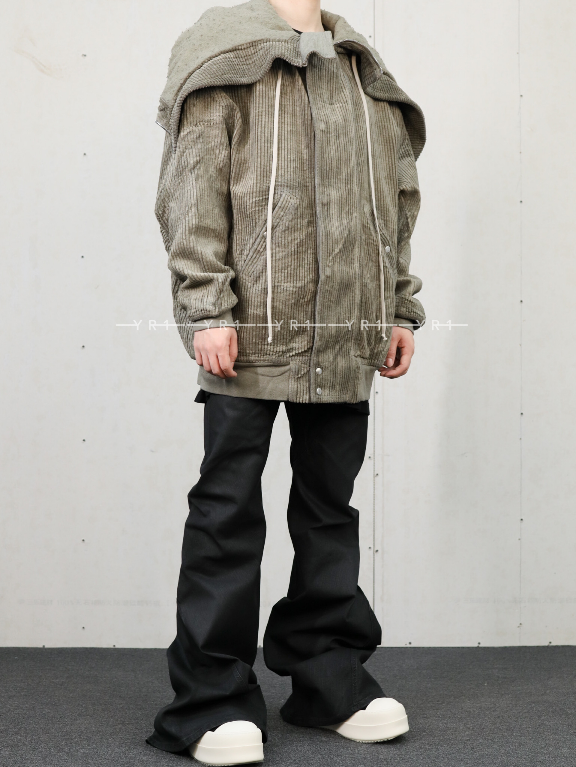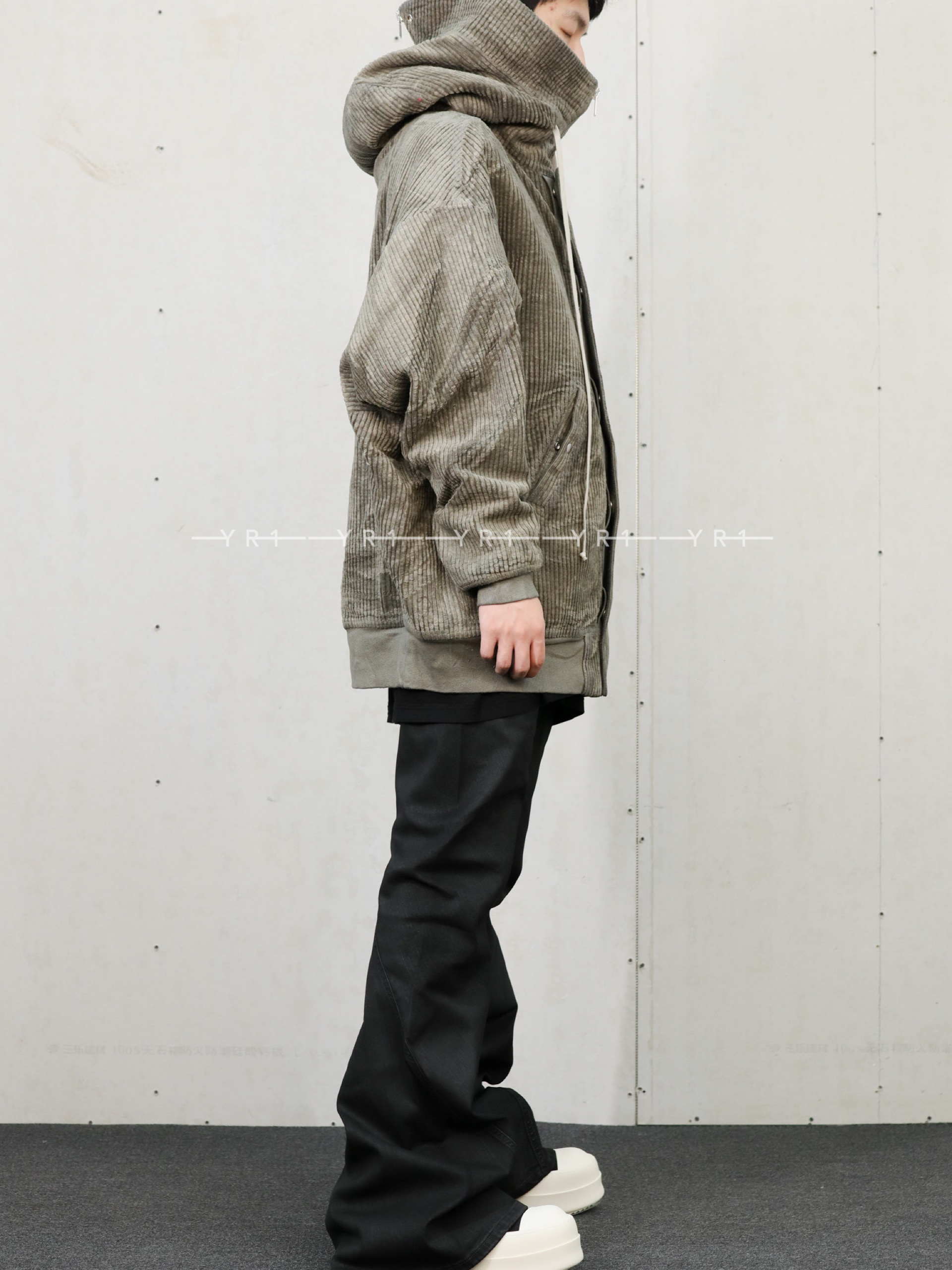 这款重磅大号灯芯绒面料采用成衣染色,表面覆盖透明箔。手感干燥、蜡质。