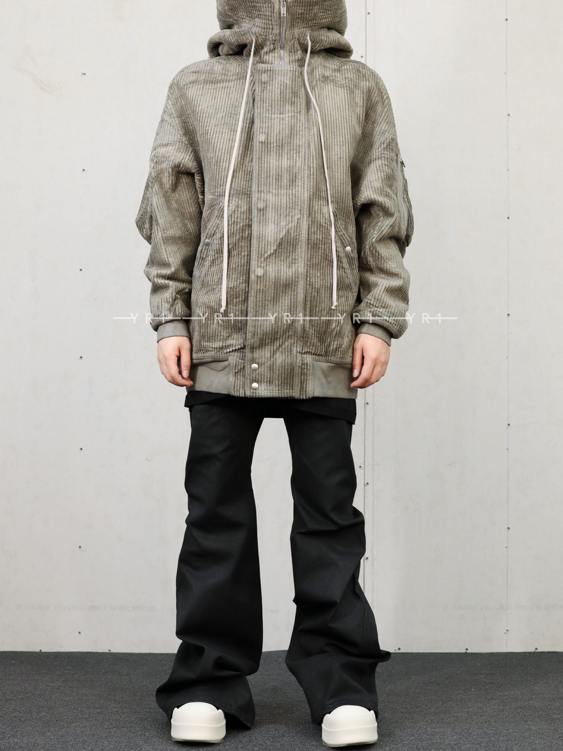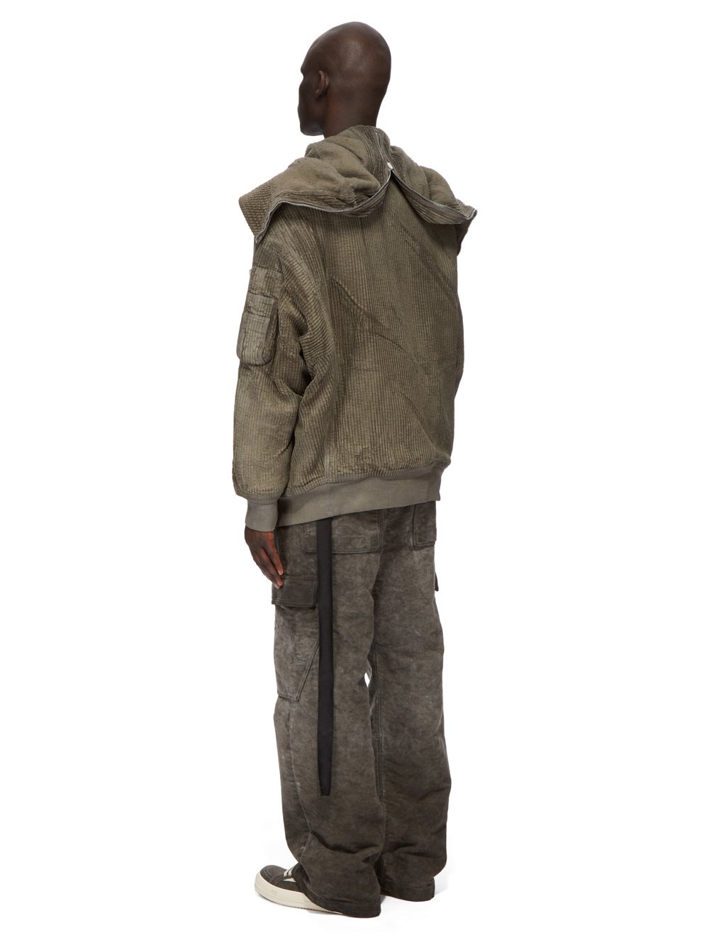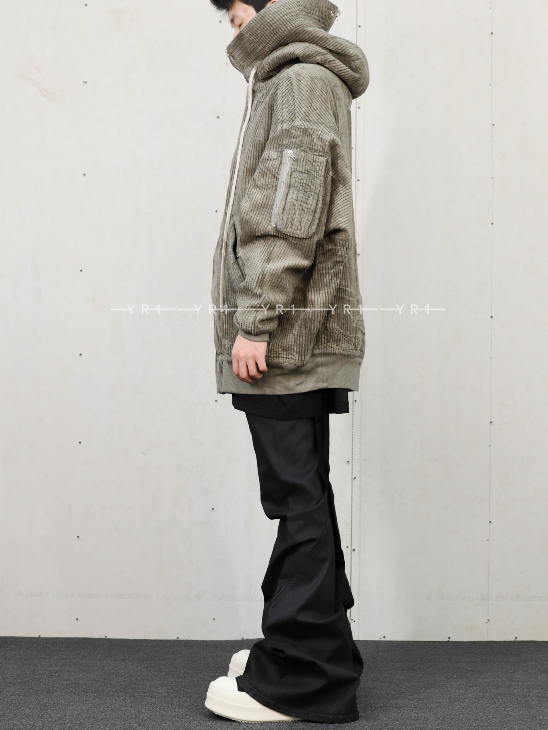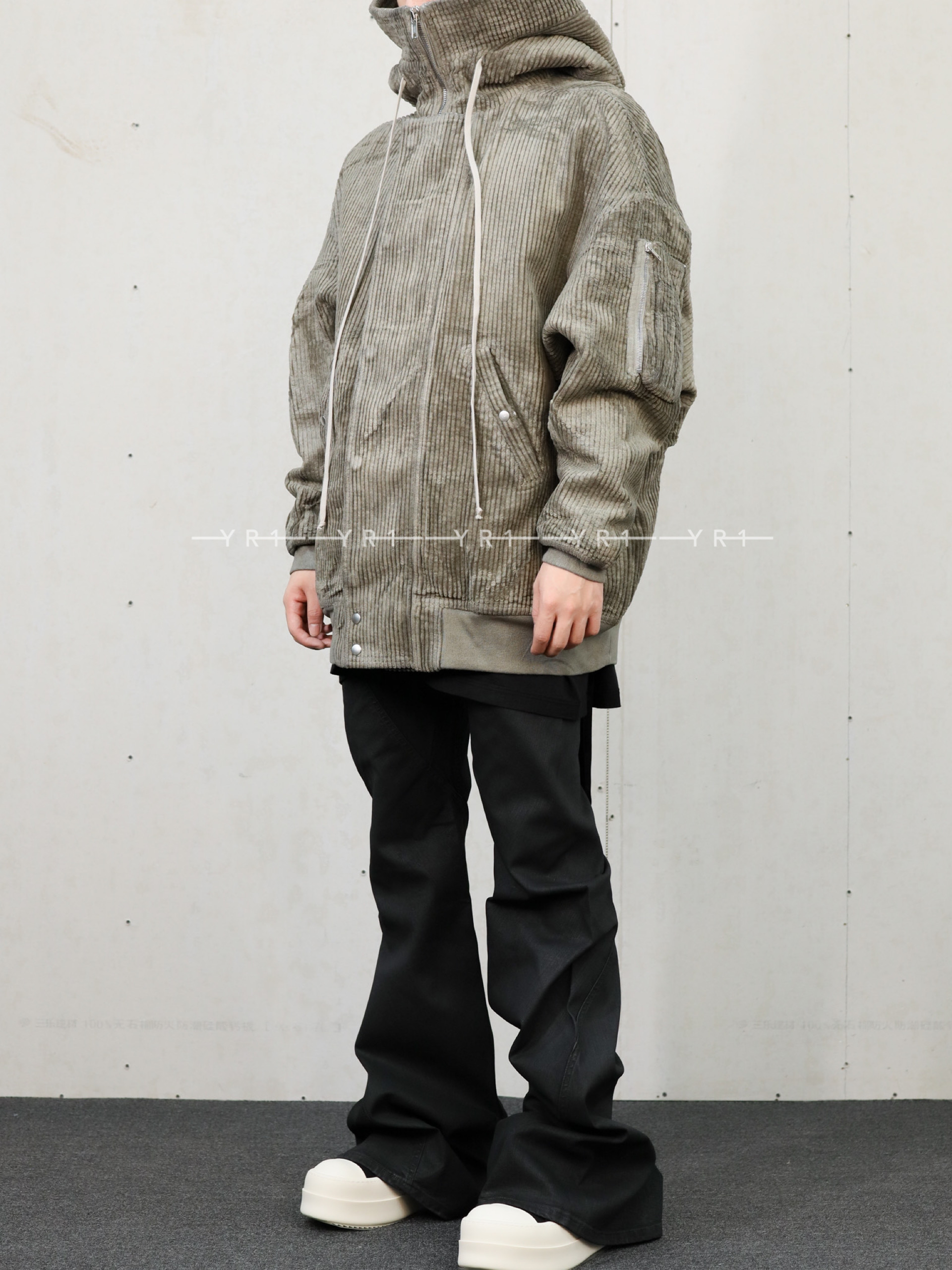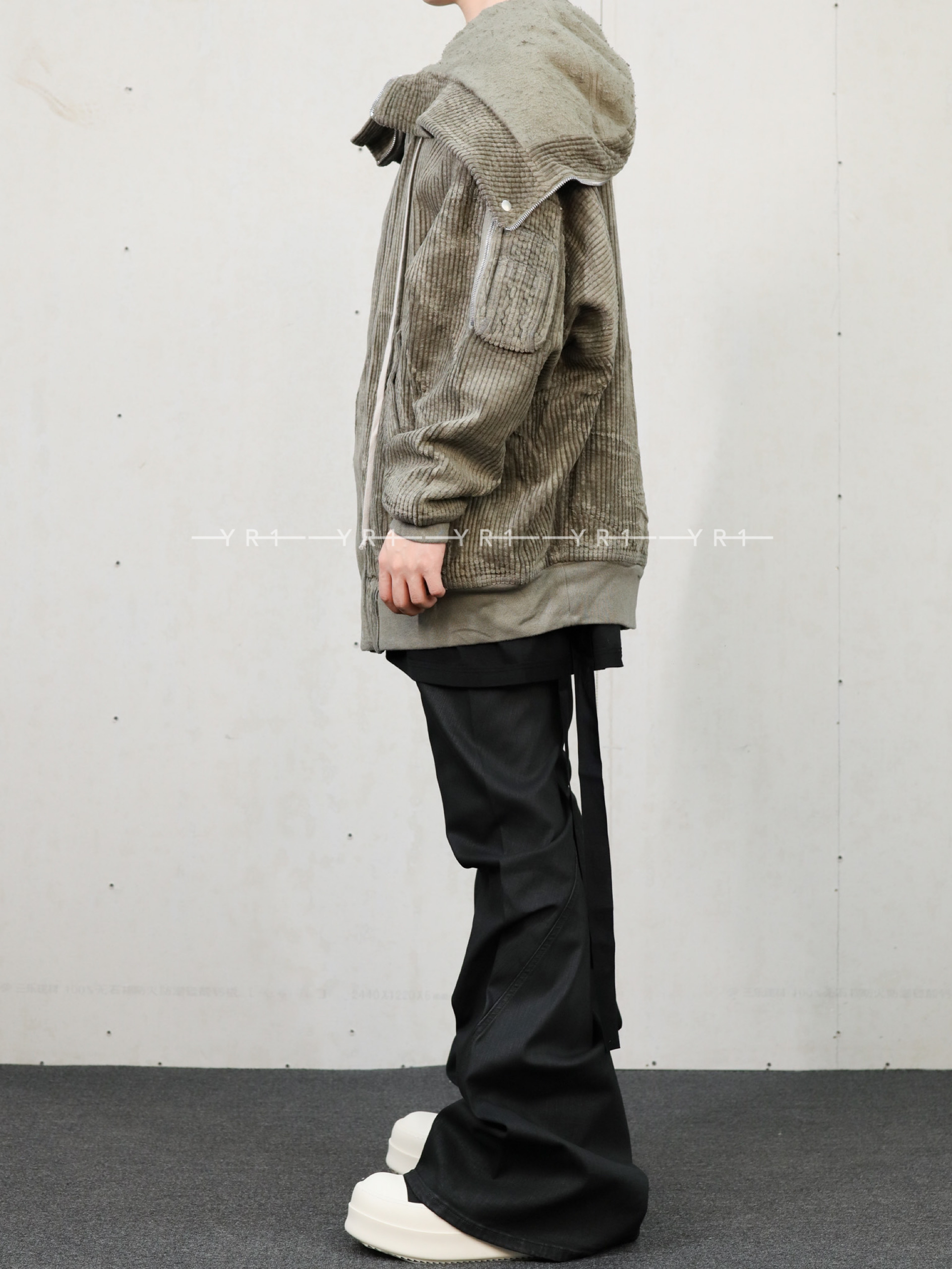 这款重磅大号灯芯绒面料采用成衣染色,表面覆盖透明箔。手感干燥、蜡质。