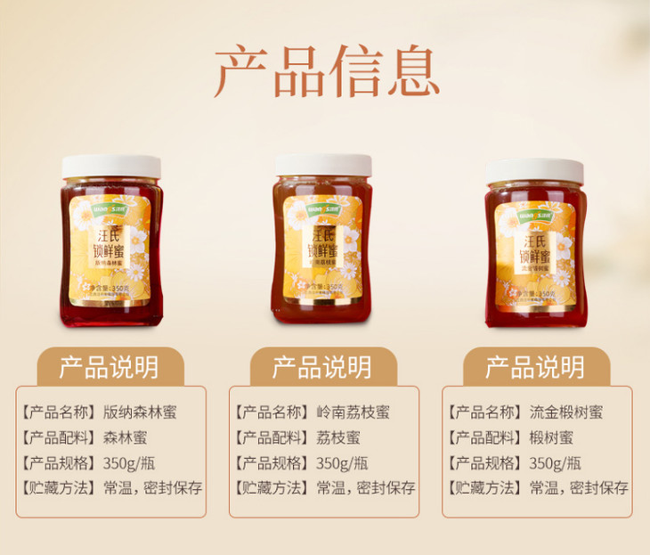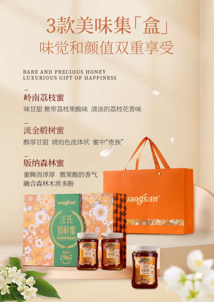 【汪氏】锁鲜蜜礼盒流金椴树蜜350g+岭南荔枝蜜350g+版纳森林蜜350g节日送礼高端