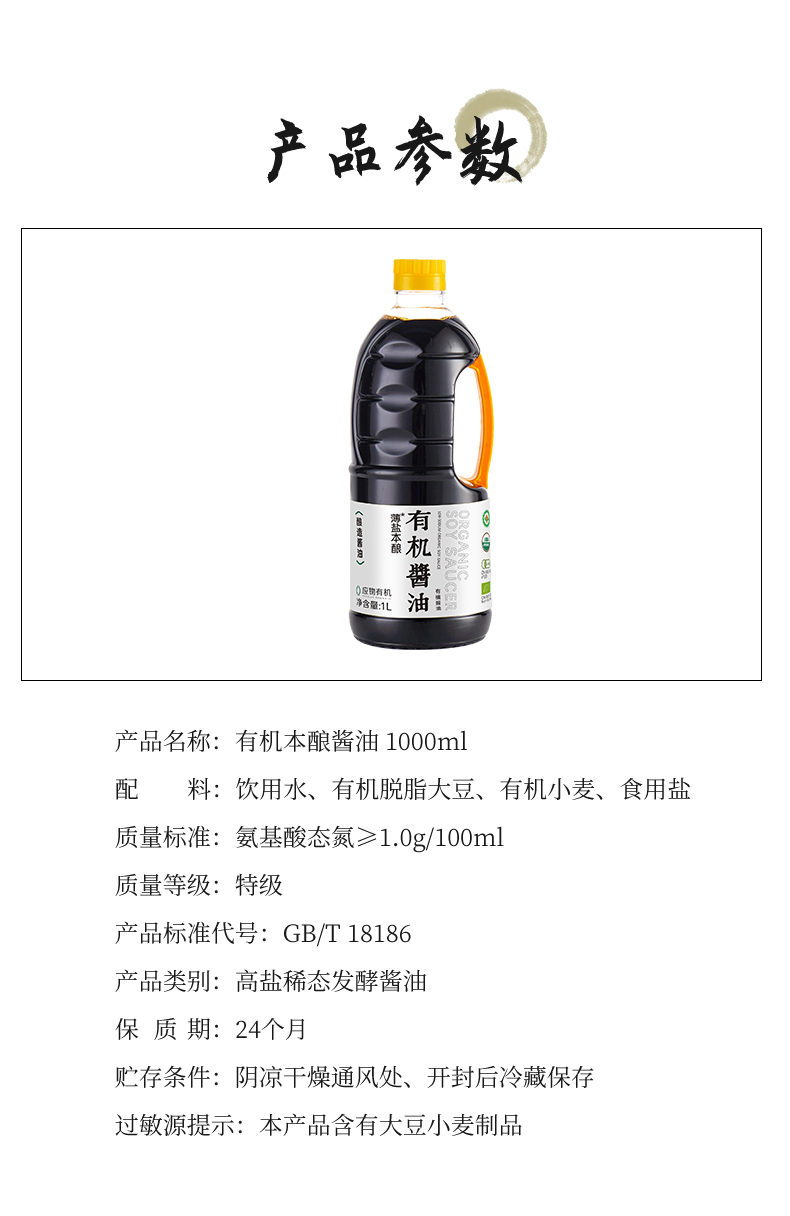 【薄盐本酿酱油】应物有机特级酱油家用特级纯粮酿造酱油 有机调味料烹饪1L大容量