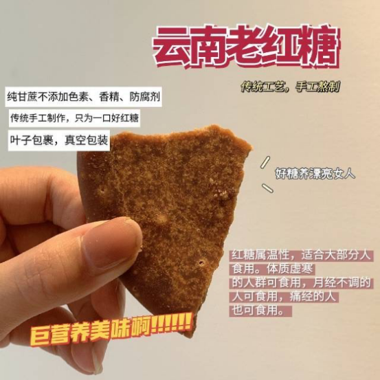 市面上也有很多的红糖 但是品质参差不齐 劣质糖除了长胖以外还伤身 那这次带来这款来自云南彝族的纯手工叶子红糖 是我们挑选了很多款以后才决定的 那怎样才能判断出一款正宗的红糖呢 总结成个方面就是: “看”、“闻”、“切”、“泡”