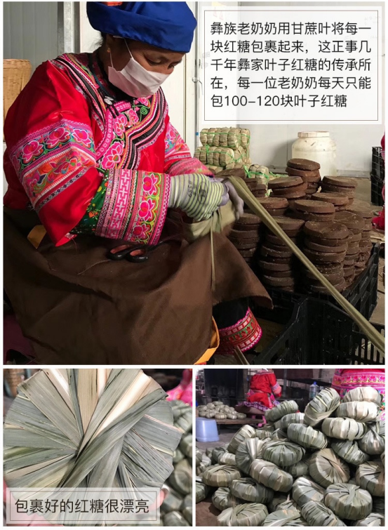 红糖凝固成型后 彝族村民们采用甘蔗叶来包裹红糖 从而便于红糖存储 新鲜扒下来的叶子晒干后包裹红糖 不仅可以防潮,又便于存储 还使得红糖保留了叶子的清香味