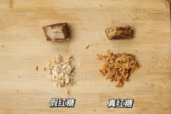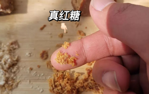 看 真红糖:含甘蔗汁中的甘蔗纤维,湿润、细腻 假红糖:密度高,干燥粗糙、颗粒感强