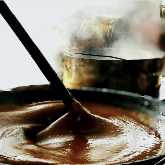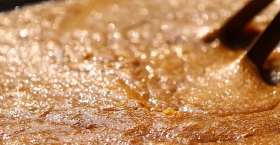 刚榨出的甘蔗汁需要经过多遍纱布过滤 保证糖水和渣滓的分离 过滤后的甘蔗汁就可以开始熬糖啦 为了保证熬制的口感 熬糖师傅坚持只用柴火和铁锅 这样制作出的红糖才香而不焦 熬煮过程最重要的就是长达6-8小时的不停搅拌 看似简单机械的搅拌却需要很娴熟的技巧 搅得过慢会让锅底出现板结 影响糖的口感和细腻 经过6次熬煮打沙 最终18斤甘蔗才能熬出1斤的红糖