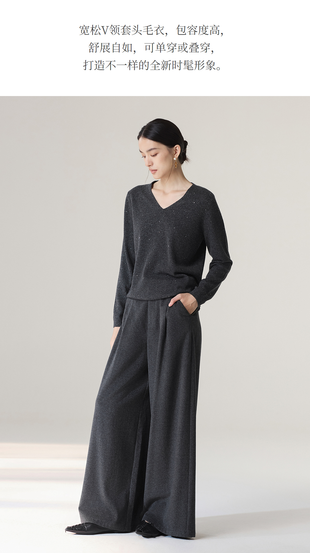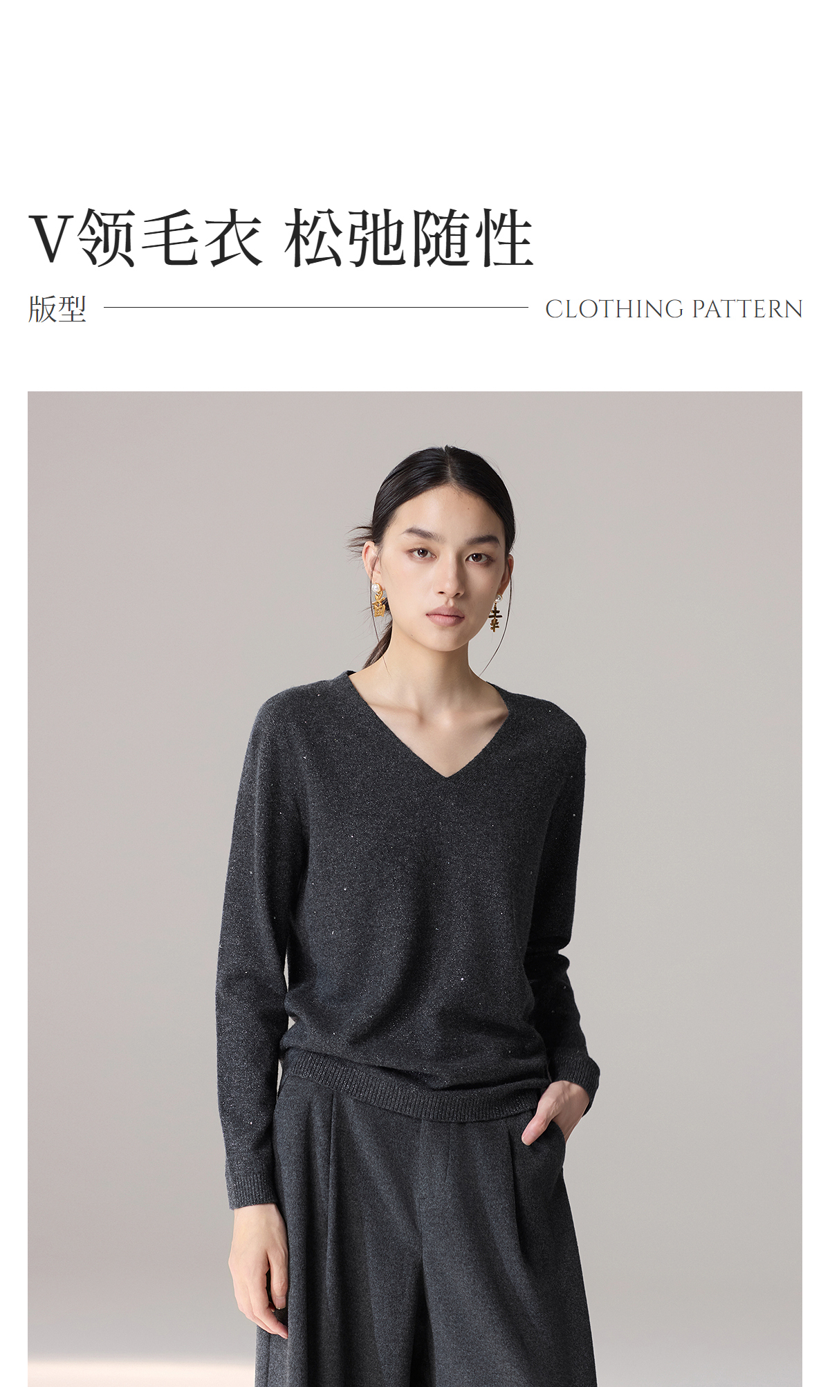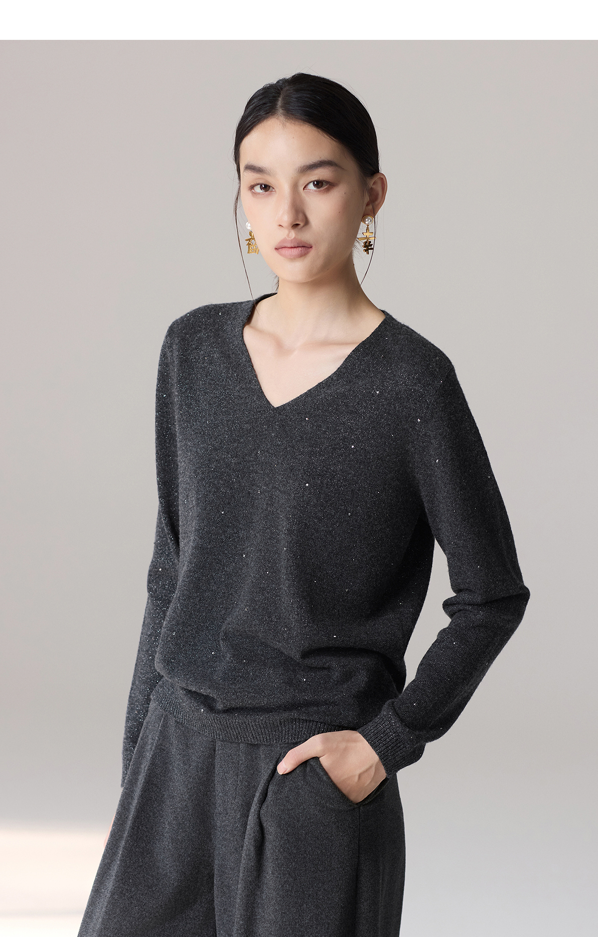 【林栖设计小店】V领绵羊毛织上衣优雅百搭多色珠片显瘦2025秋冬新款长袖毛衣1954029