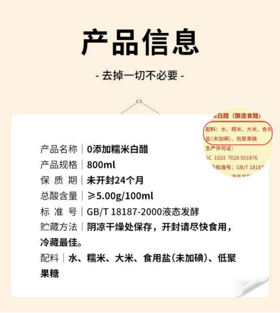 简单纯粹,才是好醋 好醋源于好原料!这瓶白醋配料超简单:糯米、大米、食用盐(未加碘 )、低聚果糖 ,没有花里胡哨的添加,纯粹粮食发酵,酸香柔和又自然 。 每一滴都藏着“精选配料”的用心,给餐桌添一份健康本味~