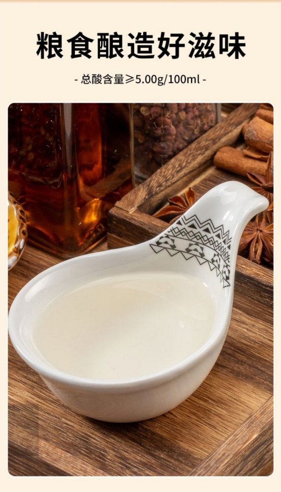 粮食酿造,好滋味的底气 为啥这瓶白醋这么香?因为坚持“粮食酿造好滋味” ! 总酸含量≥5.00g/100ml ,精选原料经传统工艺发酵,酸香自然柔和 。 倒在碟子里,清澈透亮的醋液,满满都是纯粮酿造的醇厚感,做菜加一点,味道瞬间“升舱”~ 总酸含量(≥5.00g/100ml )等信息明明白白 。 遵循GB/T 18187 - 2000液态发酵标准,阴凉干燥处保存,开封后尽快食用更美味~