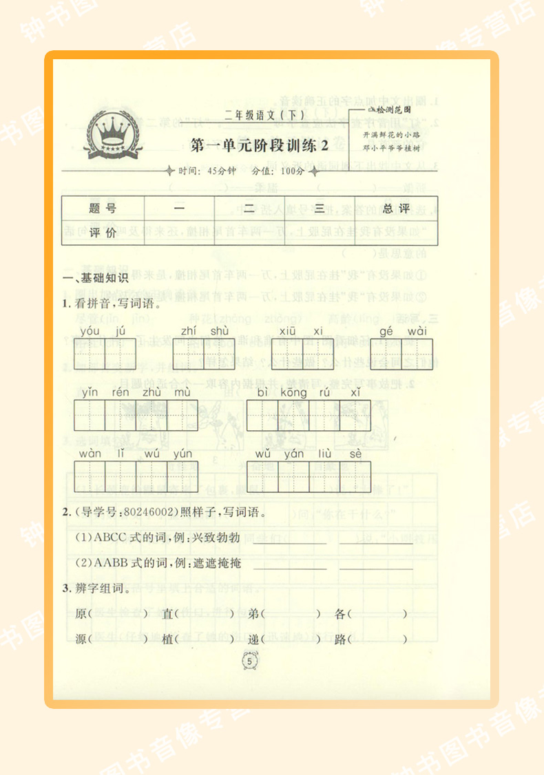 新版钟书金牌教辅 金试卷 语文 2年级下/二年级下 语文 第二学期 满分训练与测试 分层训练 单元检测易错专项期中期末卷课外练习卷