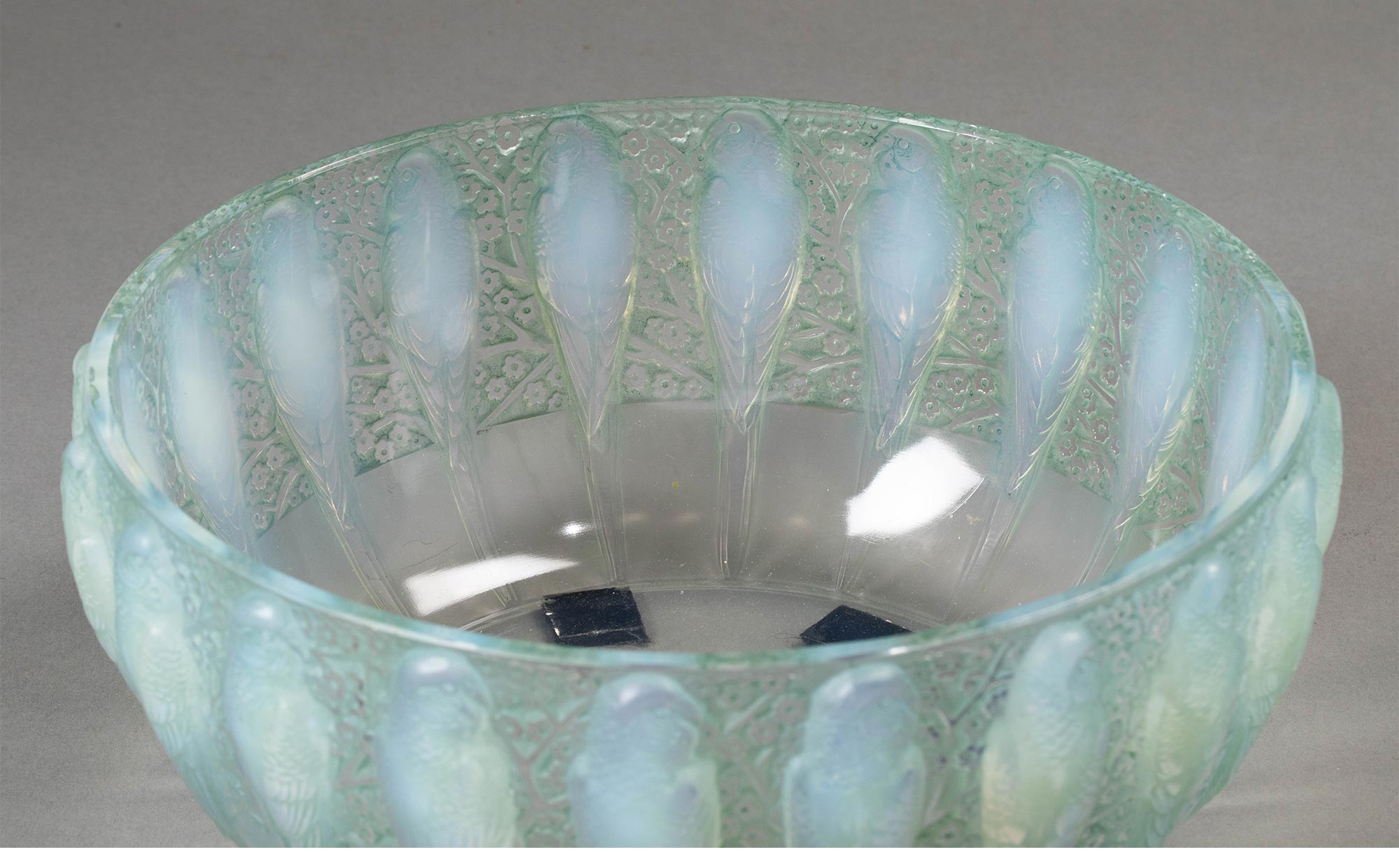 1931年法国顶级水晶工坊莱俪LALIQUE设计出品「Perruches 鹦鹉」主题蓝绿色欧泊水晶碗