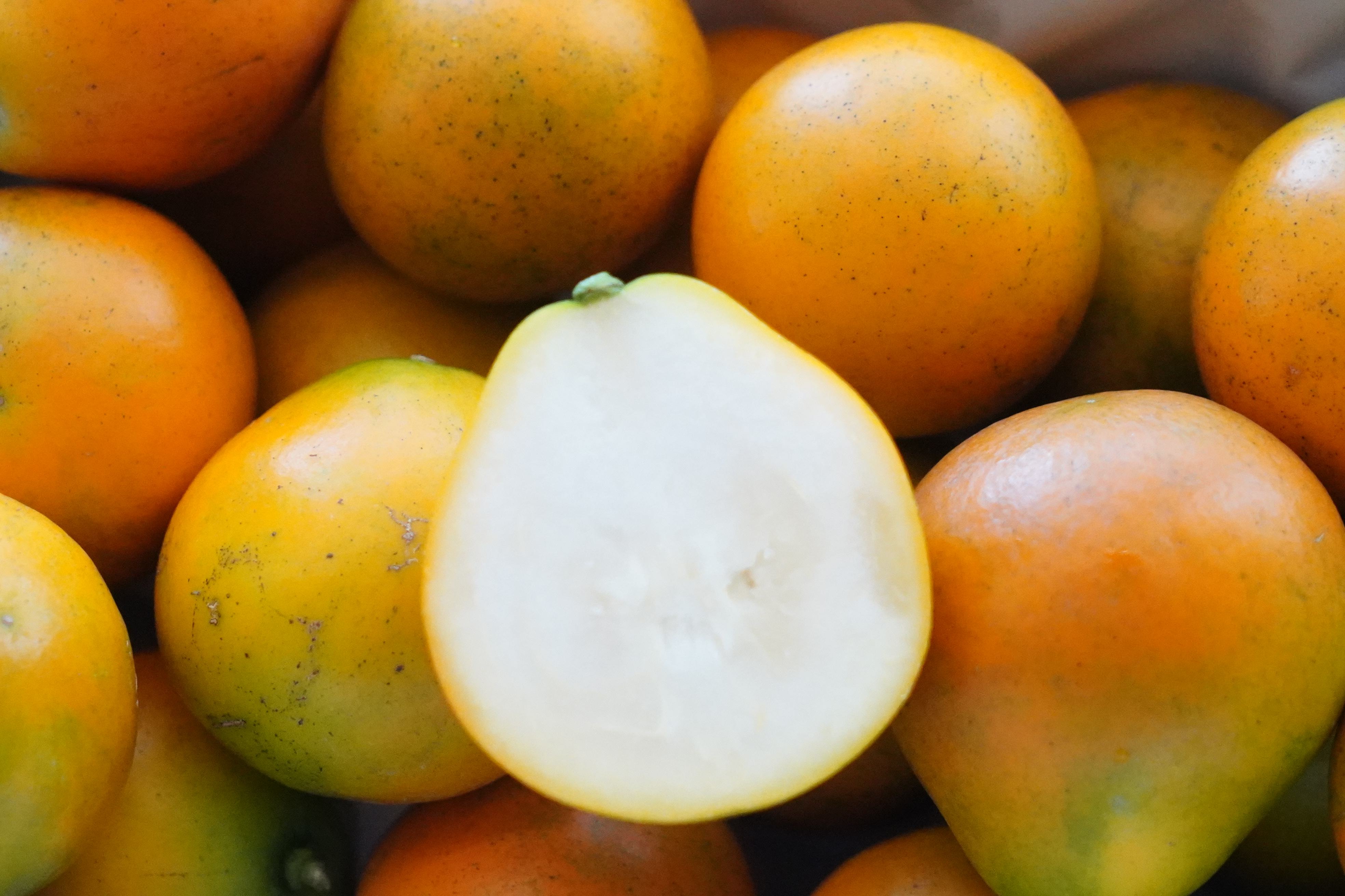 最后还是让我们找到了,期间又试吃了很多来自融安的金桔,懂得了些门道。融安金桔的本土品种叫“滑皮金桔”,相比于其他产地金桔更优一些,个大饱满,但皮还是硬的,且汁水不多。这几年从滑皮金桔种类中选育出来的新品种叫做“脆蜜金桔”,这是今天的主角。皮一定是薄脆的,多汁甜美,基本无渣,如同一颗水果炸弹。金桔相比于橙子,更接近佛手类的香气,有迷人的柑橘系芳香,这也是很多人喜欢金桔的原因。