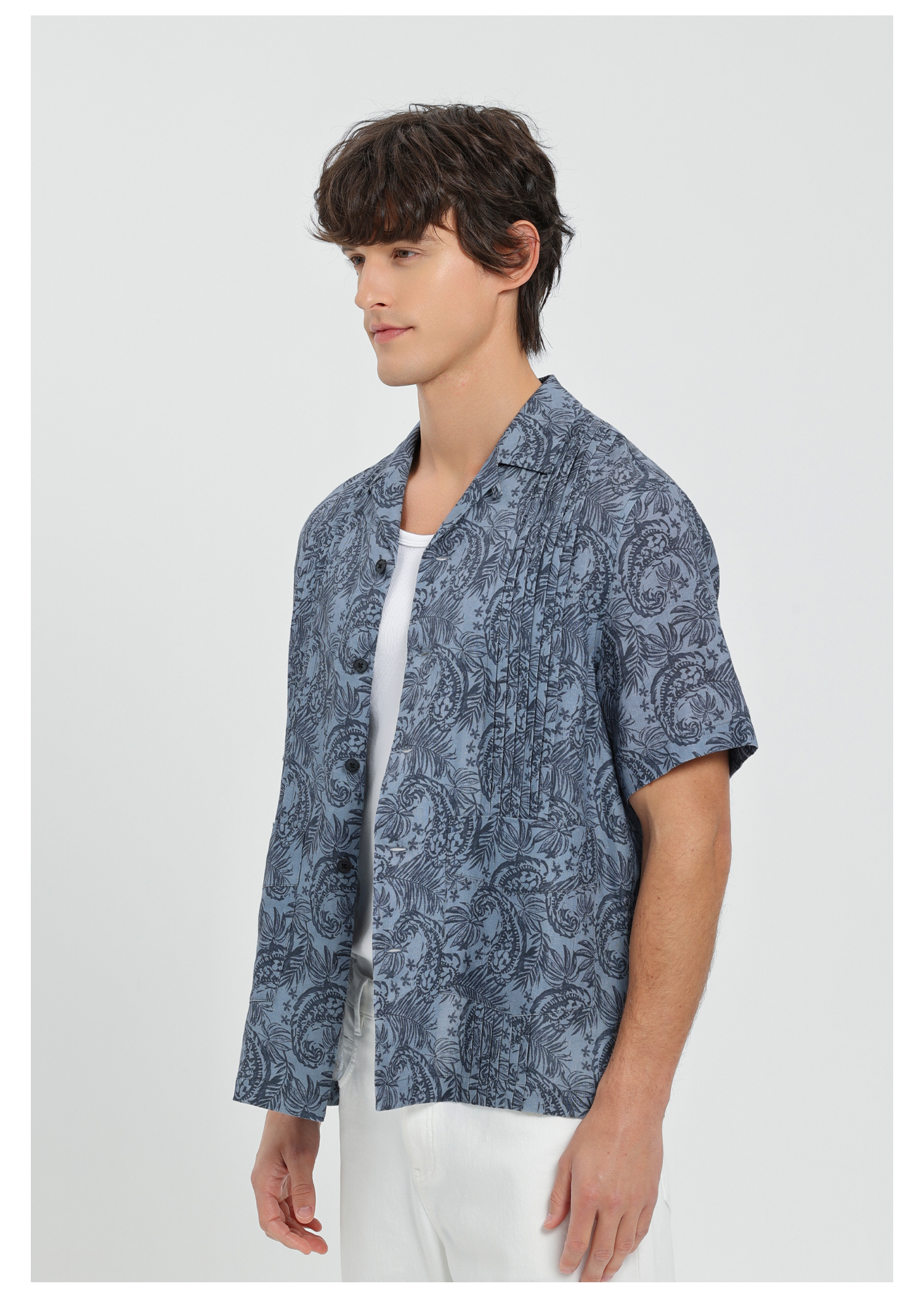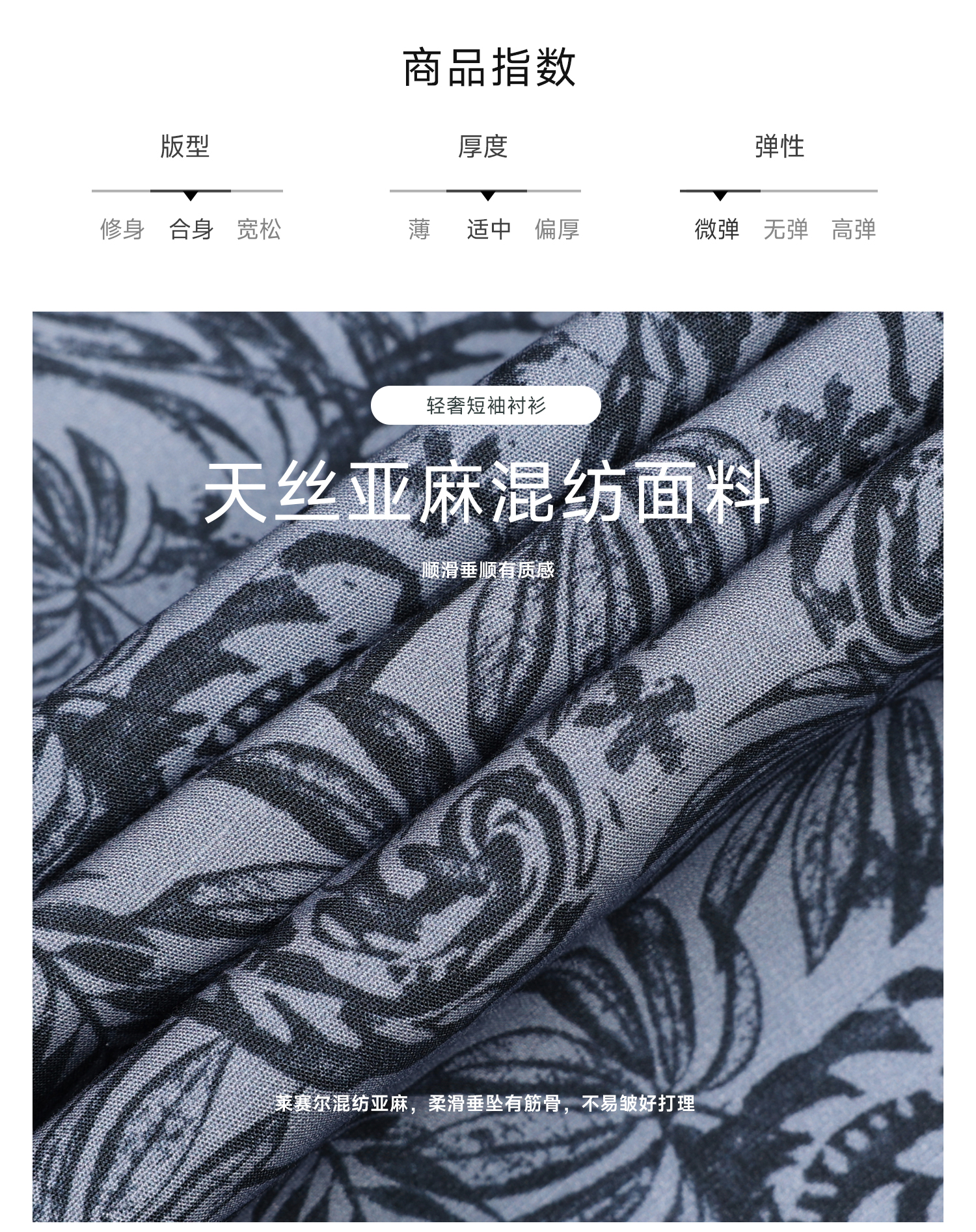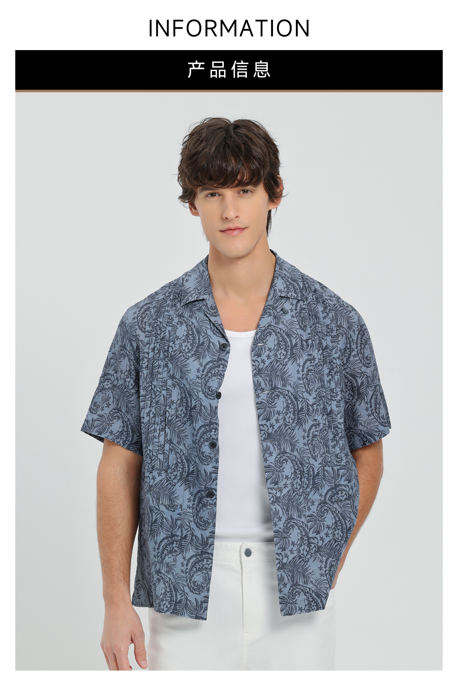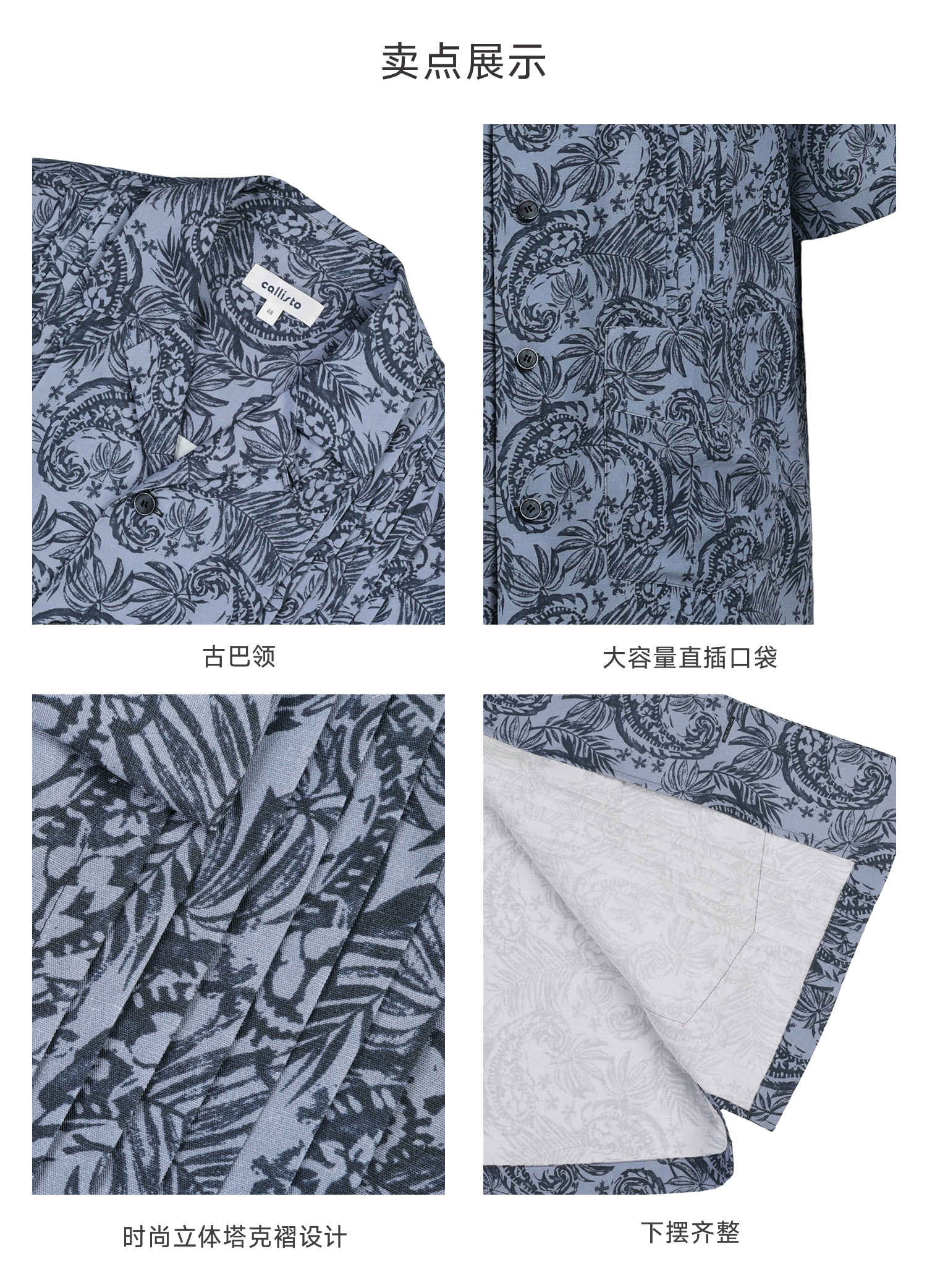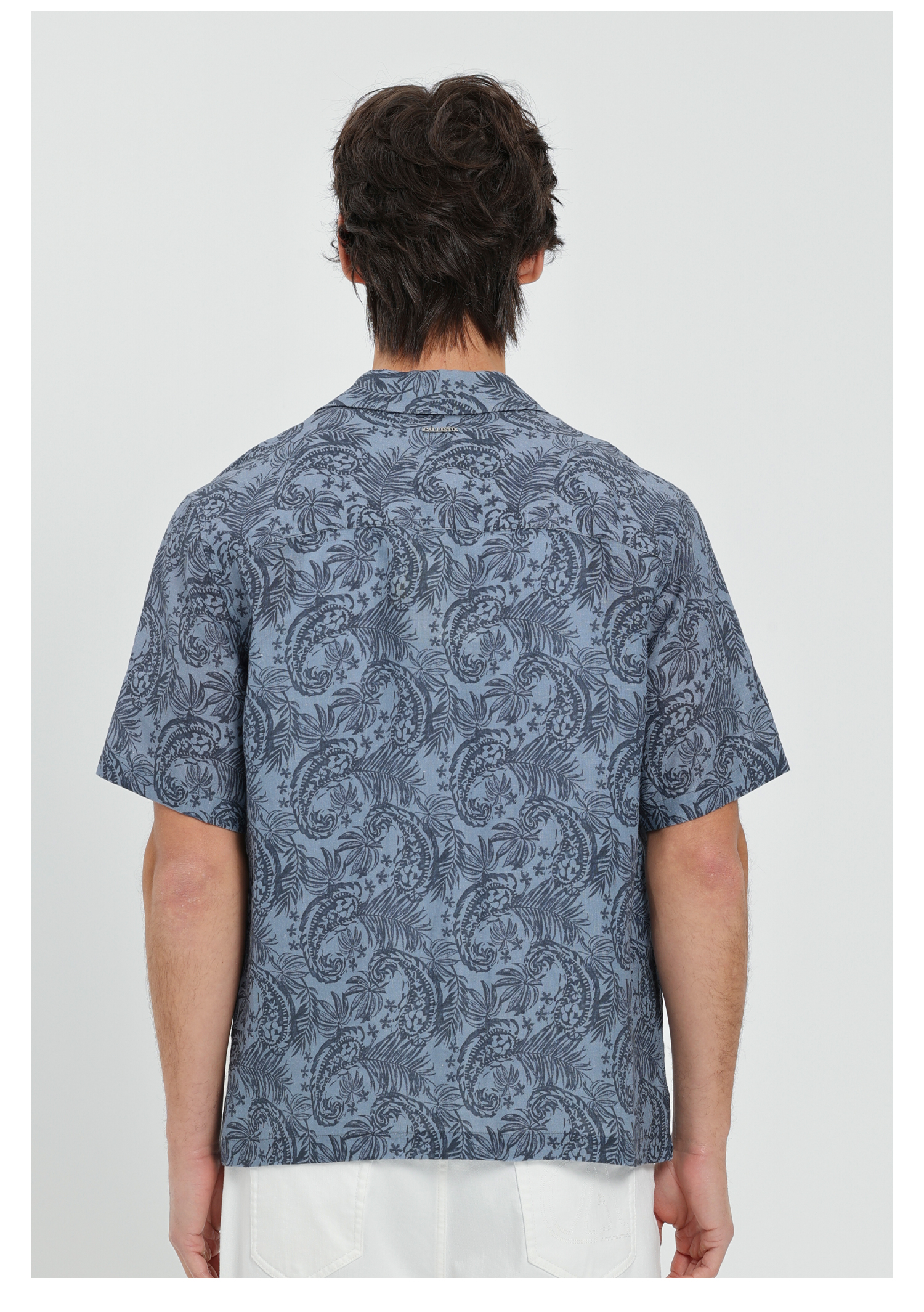 callisto蓝色莱赛尔混纺亚麻植物印花短袖衬衫