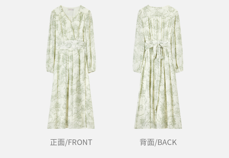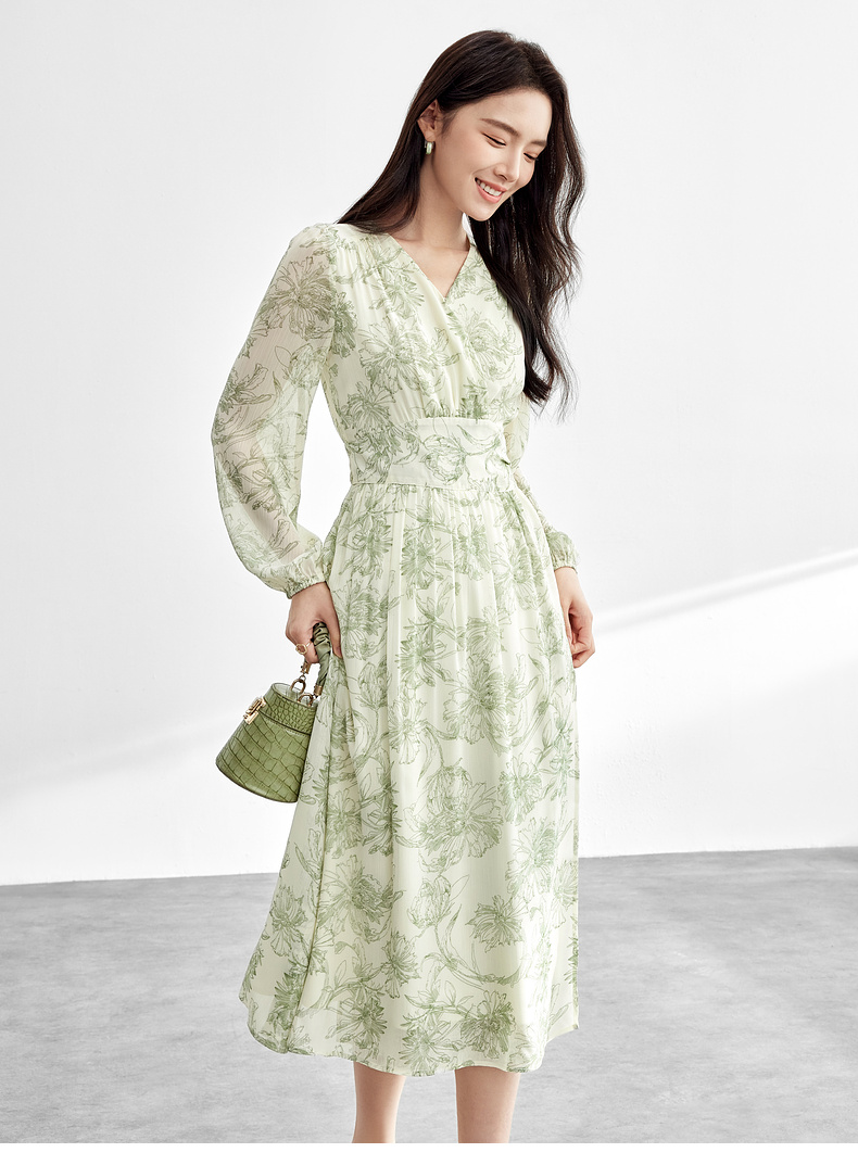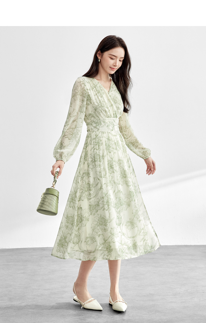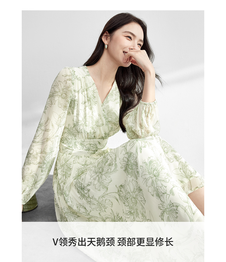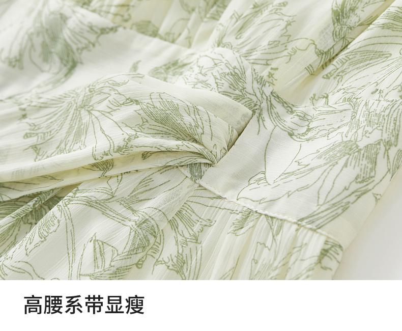 【内购】【花卉印花】优雅度假V领灯笼袖高腰系绑带收腰显瘦中长款连衣裙-151L57736